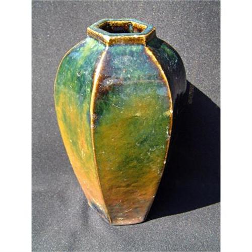 Very rare Tang period hexagonal shape vase with a mirror greenish yellow glaze. The base has a brownish-red glaze with some minor edge chips at the edge not visible when the vessel is standing. Height: 9.8" (25 cm.).