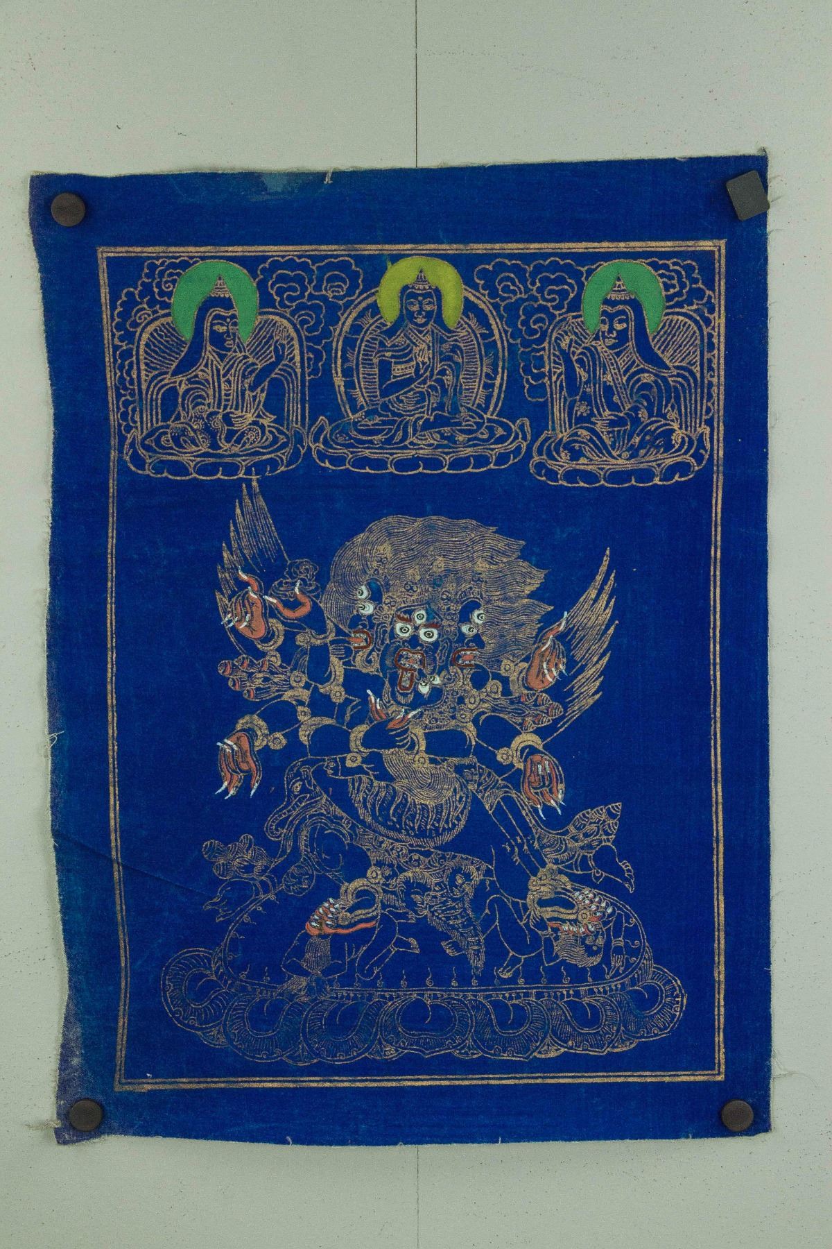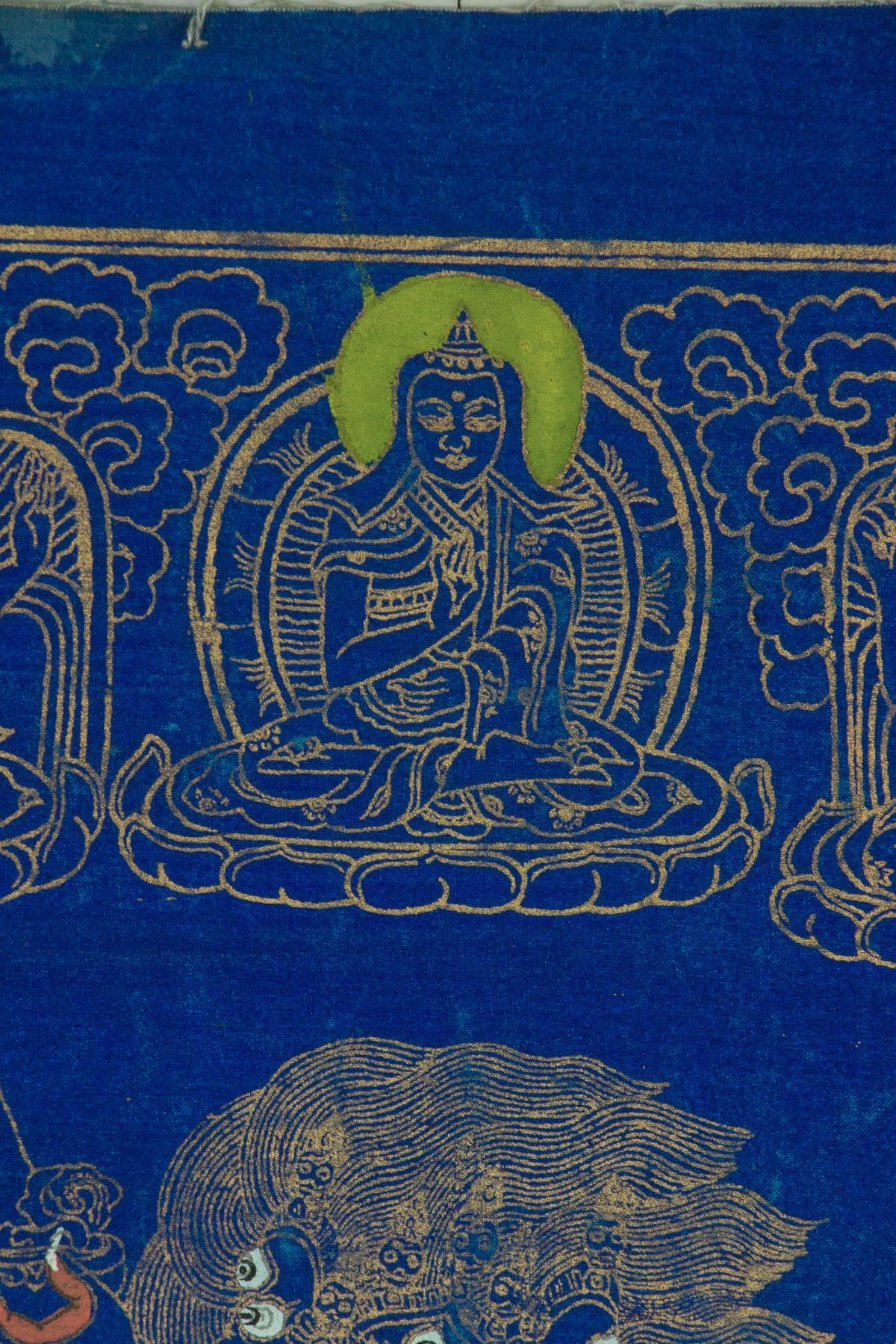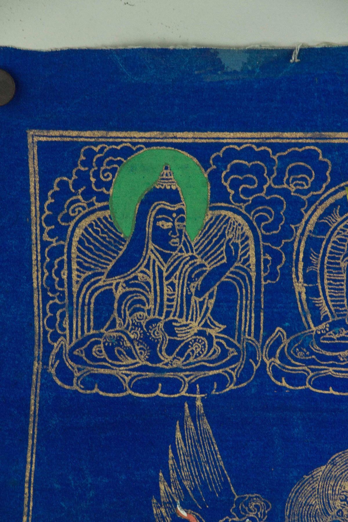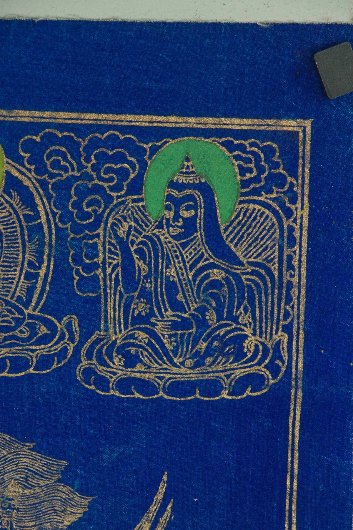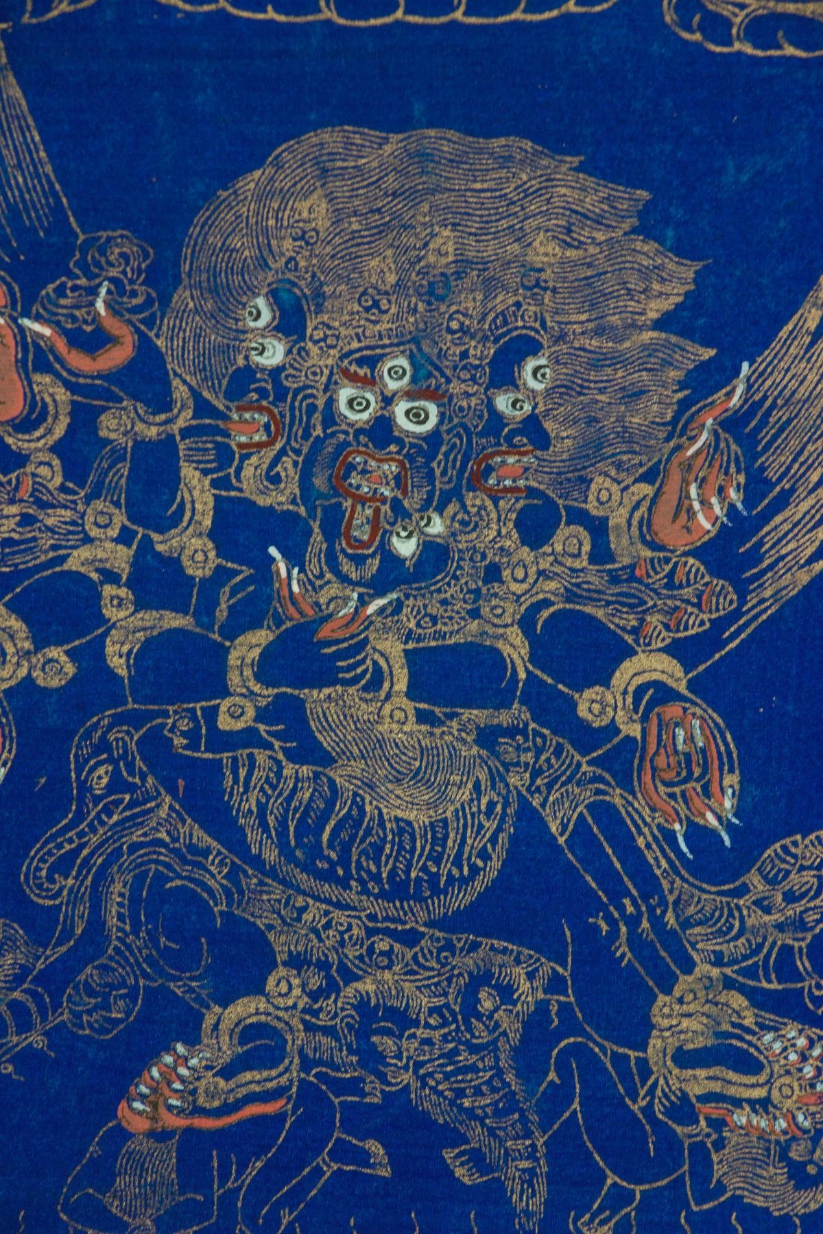 Gilt line drawing of three-faced three-eyed Buddha sitting on lotus plinth; all reserved on blue ground; red seal on back; 56 cm × 43 cm