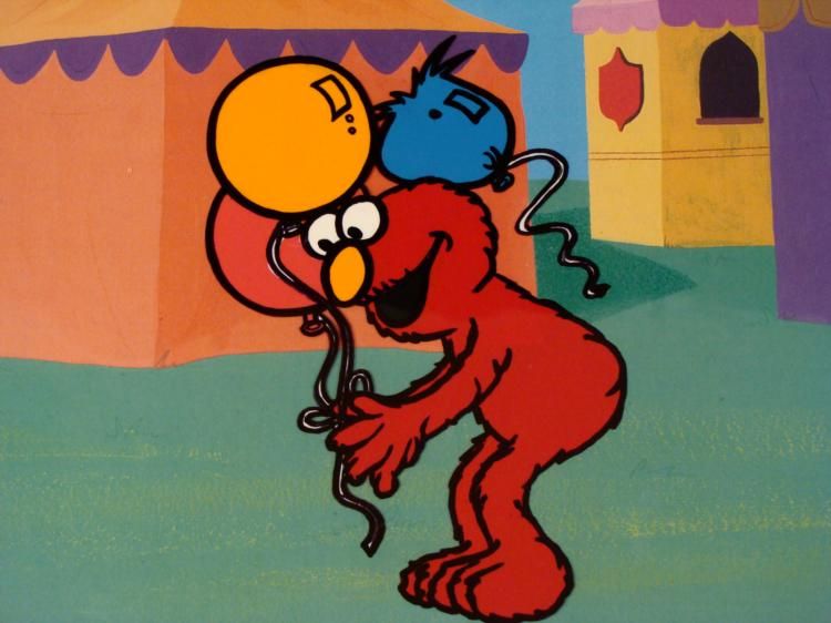 In Elmo's world everyone is happy and full of laughter. Elmo enjoys making friends and having a good time. In the cel, Elmo has his balloons tangled * * * * Original Animation Cel & Printed Background * * Medium: Hand painted acetate celDetails: A