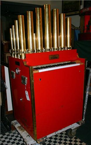 Calliophone by Tangley Calliope Miner Mfg. Co. Ft. Madison, Iowa. 43 keys and pipes Plays either by keyboard or paper roll. Produces smooth, pleasing tones and great volume.