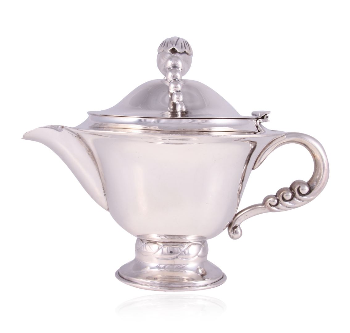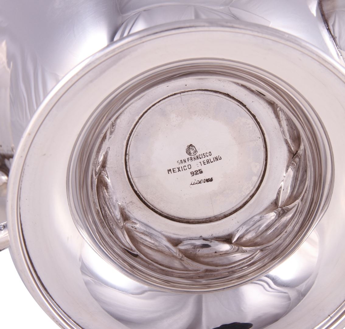 Tango aceves coffee and tea service, Mexico, c. 1965 | STERLING SILVER, Blossom Set includes teapot, coffee pot, sugar bowl with lid, creamer, waste bowl and tray. Signed with impressed manufacturers marks to each element: Aceves Sterling 925 Mexico San Francisco with touch marks. Tray weighs 2483 grams and measures 27" x 17.25", coffee pot weighs 1096 grams and measures 10.5" x 8.5", teapot weighs 984 grams and measures 7"x 8", creamer weighs 562 grams and measures 6" x 7", sugar bowl with lid weighs 474 grams and measures 6" x 5", waste bowl weighs 231 grams and measures 3.5" x 4.25". CONDITION: Excellent Vintage condition, small scratches due to light use on tray. One small ding to tray. Valued between $18,000-$20,000.