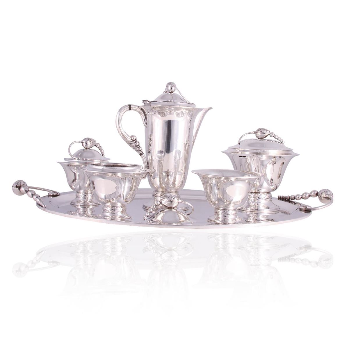 Tango aceves coffee and tea service, Mexico, c. 1965 | STERLING SILVER, Blossom Set includes teapot, coffee pot, sugar bowl with lid, creamer, waste bowl and tray. Signed with impressed manufacturers marks to each element: Aceves Sterling 925 Mexico San Francisco with touch marks. Tray weighs 2483 grams and measures 27" x 17.25", coffee pot weighs 1096 grams and measures 10.5" x 8.5", teapot weighs 984 grams and measures 7"x 8", creamer weighs 562 grams and measures 6" x 7", sugar bowl with lid weighs 474 grams and measures 6" x 5", waste bowl weighs 231 grams and measures 3.5" x 4.25". CONDITION: Excellent Vintage condition, small scratches due to light use on tray. One small ding to tray. Valued between $18,000-$20,000.