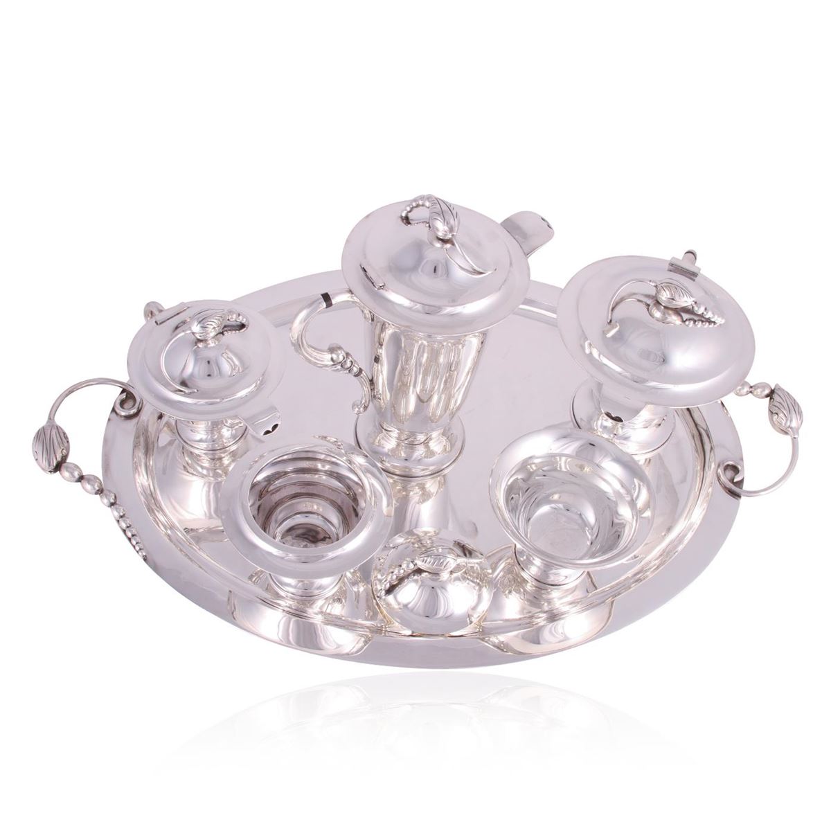 Tango aceves coffee and tea service, Mexico, c. 1965 | STERLING SILVER, Blossom Set includes teapot, coffee pot, sugar bowl with lid, creamer, waste bowl and tray. Signed with impressed manufacturers marks to each element: Aceves Sterling 925 Mexico San Francisco with touch marks. Tray weighs 2483 grams and measures 27" x 17.25", coffee pot weighs 1096 grams and measures 10.5" x 8.5", teapot weighs 984 grams and measures 7"x 8", creamer weighs 562 grams and measures 6" x 7", sugar bowl with lid weighs 474 grams and measures 6" x 5", waste bowl weighs 231 grams and measures 3.5" x 4.25". CONDITION: Excellent Vintage condition, small scratches due to light use on tray. One small ding to tray. Valued between $18,000-$20,000.