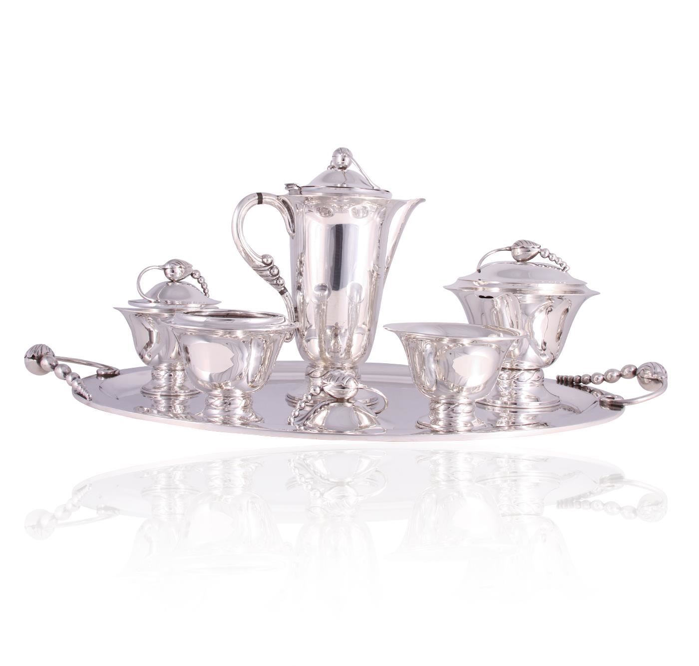 Tango aceves coffee and tea service, Mexico, c. 1965 | STERLING SILVER, Blossom Set includes teapot, coffee pot, sugar bowl with lid, creamer, waste bowl and tray. Signed with impressed manufacturers marks to each element: Aceves Sterling 925 Mexico San Francisco with touch marks. Tray weighs 2483 grams and measures 27" x 17.25", coffee pot weighs 1096 grams and measures 10.5" x 8.5", teapot weighs 984 grams and measures 7"x 8", creamer weighs 562 grams and measures 6" x 7", sugar bowl with lid weighs 474 grams and measures 6" x 5", waste bowl weighs 231 grams and measures 3.5" x 4.25". CONDITION: Excellent Vintage condition, small scratches due to light use on tray. One small ding to tray. Valued between $18,000-$20,000.