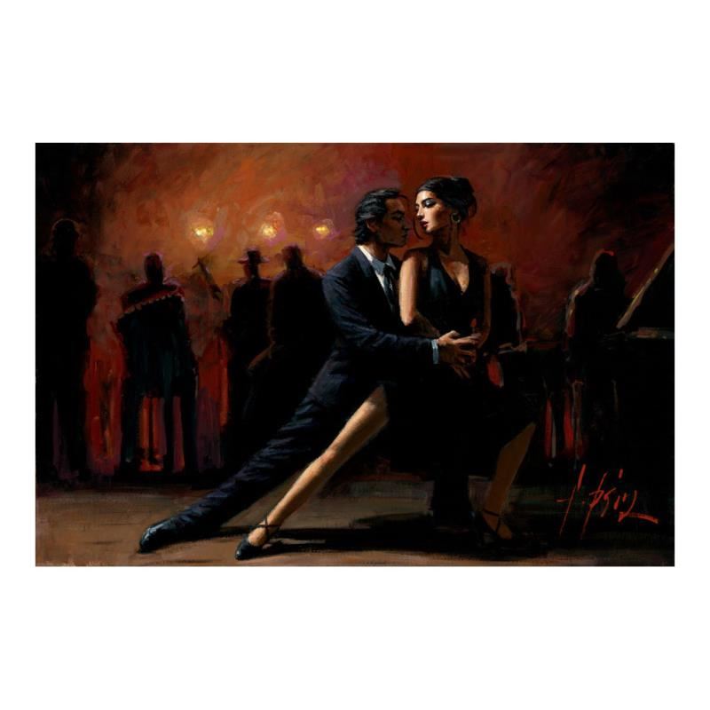 "Tango in Buenos Aires" is a hand embellished limited edition giclee on stretched canvas by Fabian Perez. The piece is numbered and hand signed by the artist and comes with a Certificate of Authenticity. Measures approx. 28" x 42" (image). Please allow 5 additional business for items that include canvas stretch or framing.