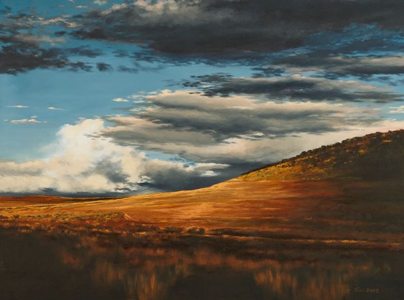 To the unaided eye, this piece appears to be in excellent condition. Inspection under ultraviolet light reveals a normal fluorescence of the artist's pigments. There are no signs of damage or restoration. The piece is framed in a textured black panel frame with a dark antiqued gold liner. The frame is in good condition, showing normal signs of wear. Verso: [sticker attached to stretcher bar] Elliott Yeary Gallery, Aspen, CO; [handwritten on back of stretcher bar] "Finding Faith" © Tania Dibbs (artist's signature) 1998 #117 54x72"