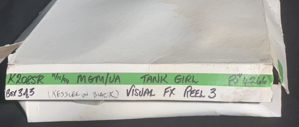 Original visual FX reel 3 production reel used in the production of the science-fiction action comedy film 'Tank Girl' (1995), directed by Rachel Talalay. Based on the British post-apocalyptic comic series of the same name by Alan Martin and Jamie Hewlett that was originally published in Deadline magazine, where a girl is among the few survivors of a dystopian Earth. Riding a war tank, she fights against the tyranny of a mega-corporation that dominates the remaining potable water supply of the planet.