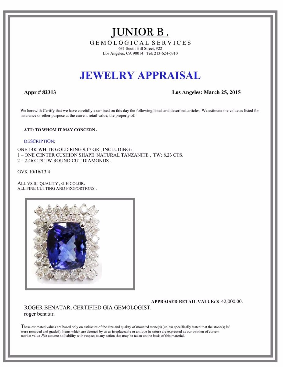14kt White Gold 9.17 Approx grams including, 8.23 ctw Tanzanite Excellent Cushion cut 2.46 ctw Diamond H color SI clarity, size 7, Appraised Retail Value$42,000.00