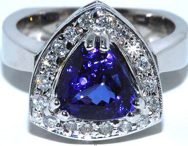 18k White Gold, Tanzanite 2.95ct Excellent Trillion Cut Very Good Color, .39ctw Round Diamond G-H color VS-SI clarity, Stunning Ring