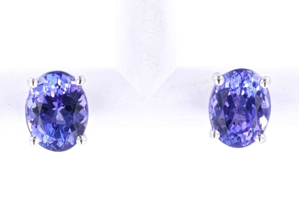 Offered for sale in this lot is a beautiful set of natural Tanzanite solitaire stud earrings set in 14K gold. The earrings show two wonderfully matched oval brilliant cut natural Tanzanite stones being four prong set with a nice violet blue coloring, beautiful depth, pleochroism (an optical phenomenon in which a stone has different colors when observed at different angles) and good eye clean clarity. Overall the two stones have a weight of 4.73 carats. The Tanzanite is a very rare precious gemstone found only in the Usumburu Mountains that border the Umba Valley of northern Tanzania. The 14 karat white gold studs have a gold weight of 2.12 grams. These are brand-new in pristine condition.