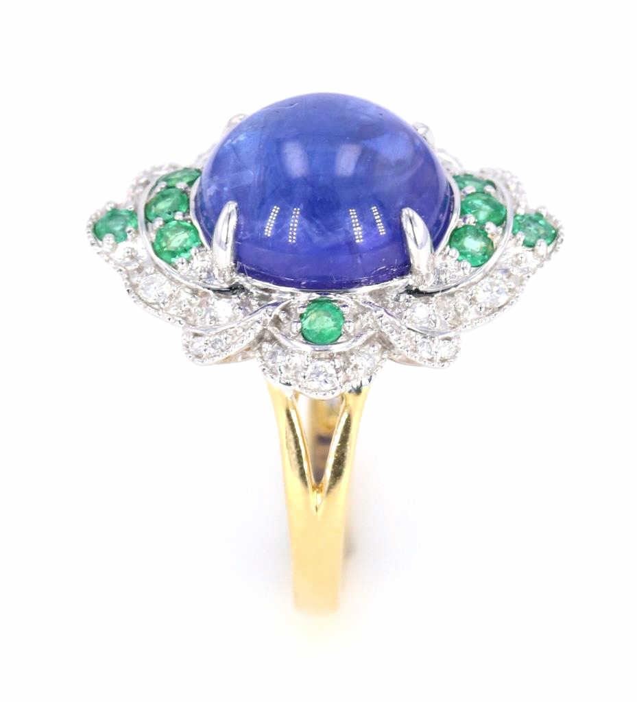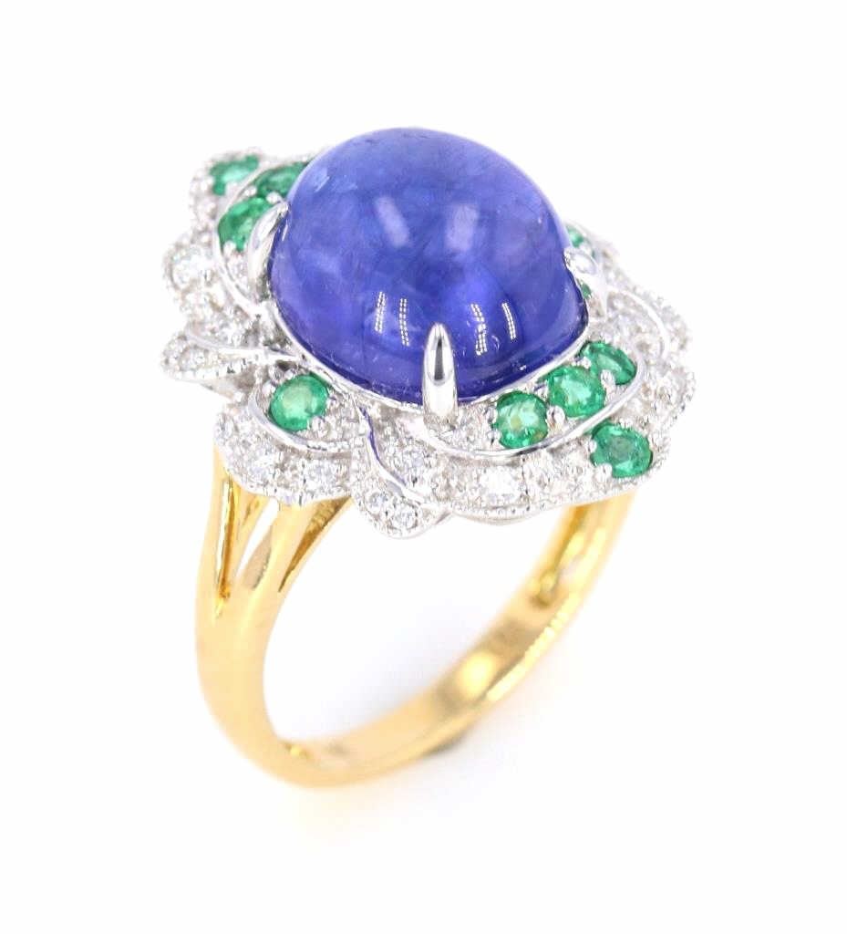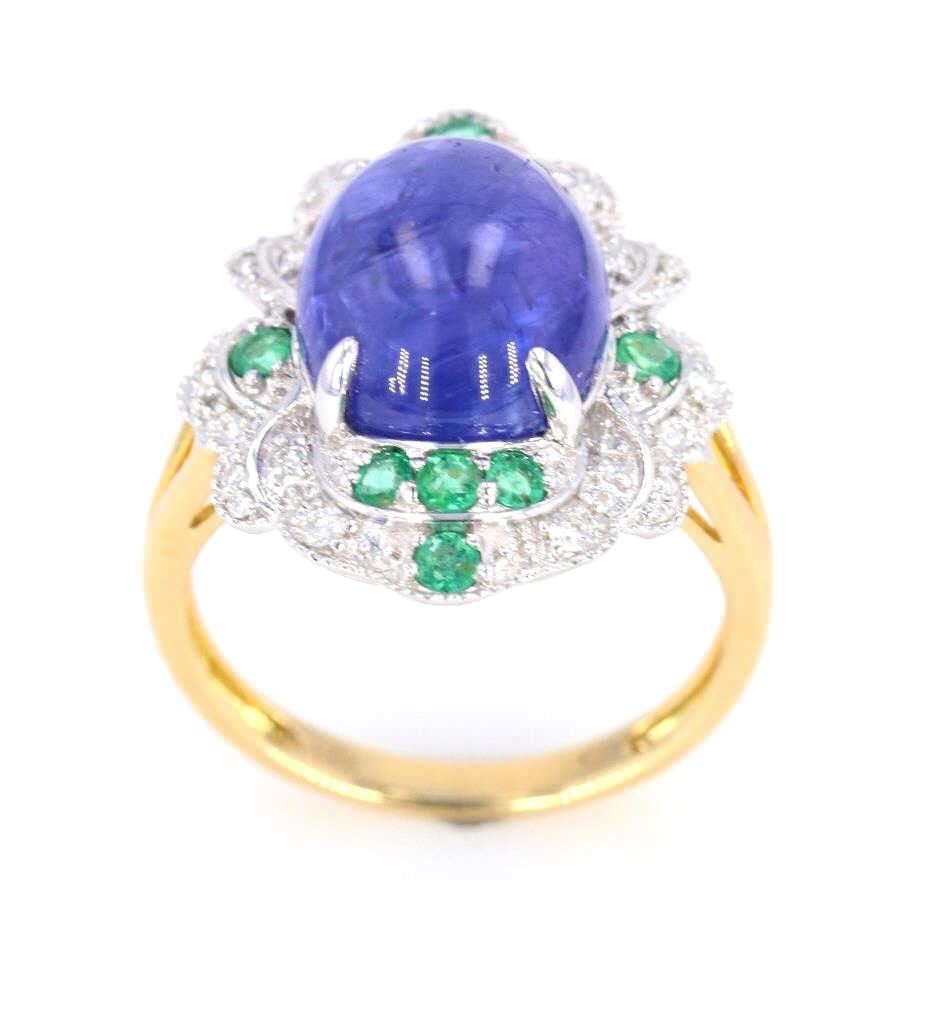 The lot features a large natural Tanzanite stone in an Antique style delicate setting with Emeralds and Diamonds. The ring shows a 18 karat white gold antique 1920’s style showing a prong set polished cabochon of natural Tanzanite with size of 7.28 carats being oval and having the desirable violetish blue coloring. The ring also shows ten natural Emerald with round brilliant cut and 0.36 carats with forest green coloring along with 22 round brilliant Diamonds in a filigree style cocktail halo. The ring has a weight of 4.79 grams and is a size of 7 US.