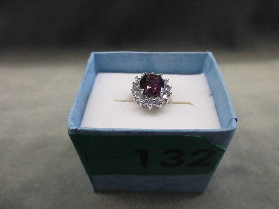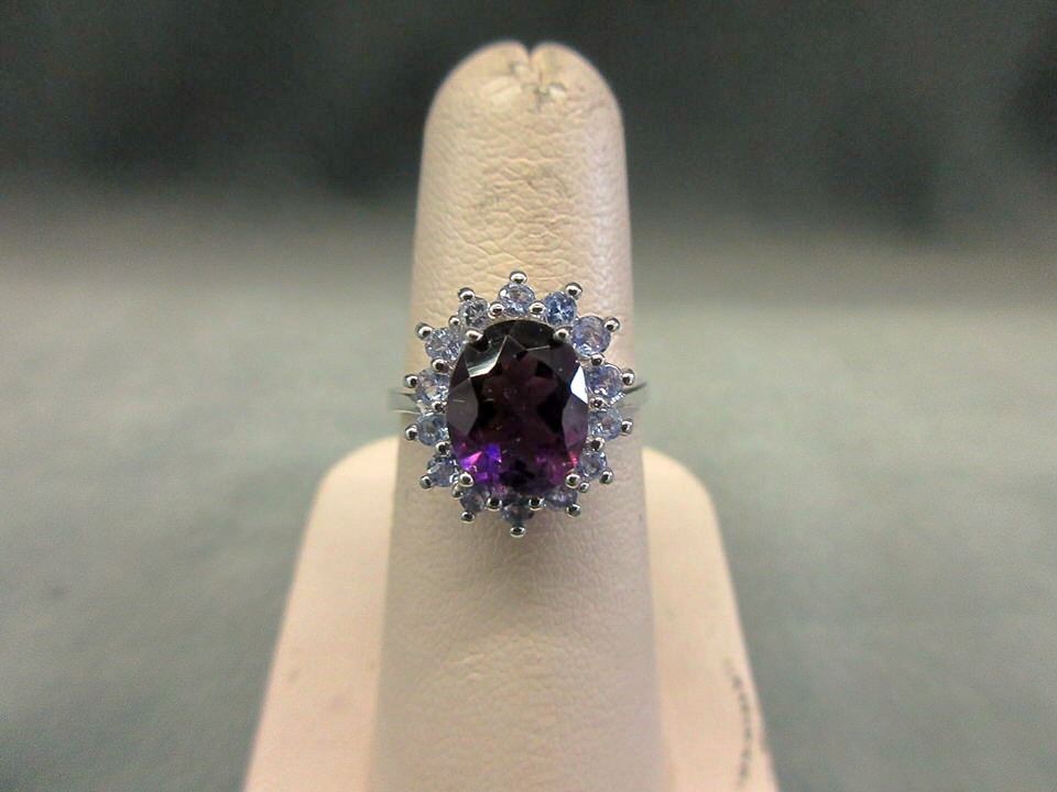 2 CT Oval amethyst center, surrounded by 14 round tanzanite. Retail value $500.