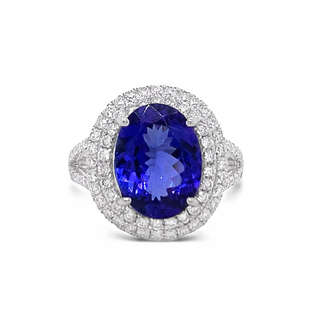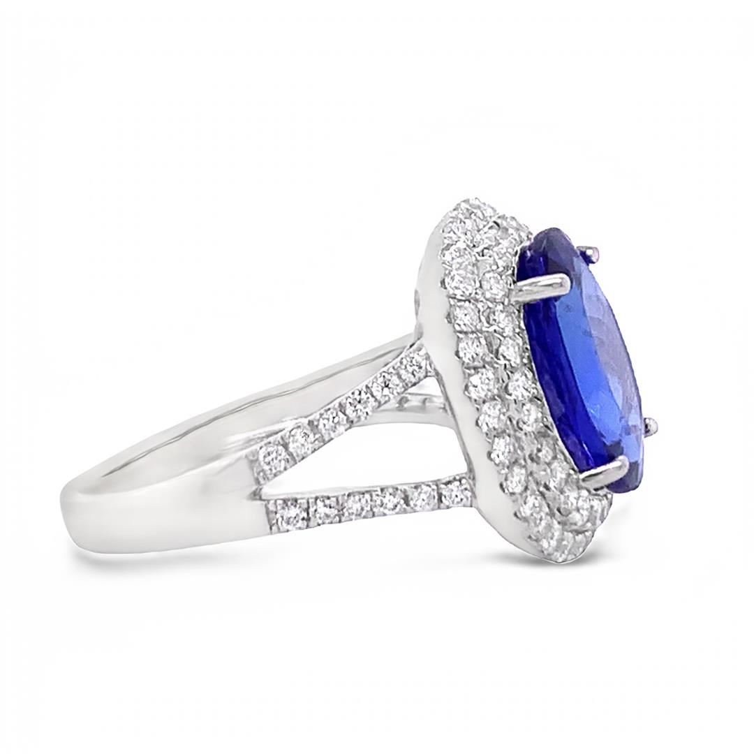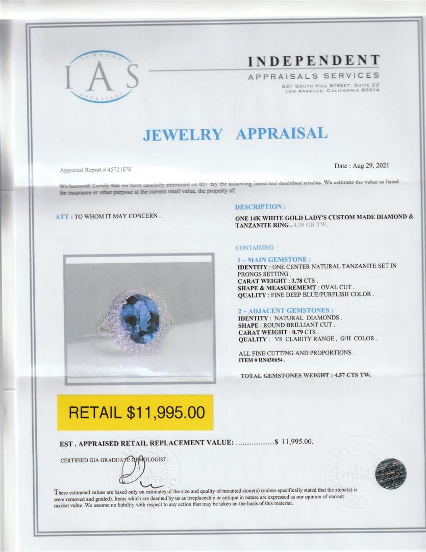 Tanzanite Cocktail Ring. Please see Photos and Description for all available information. This glamorous cocktail ring features a 3.78ct oval cut tanzanite stone surrounded by sparkling round diamonds. The 14K white gold setting is a unique design that will make this ring a favorite.