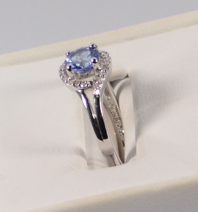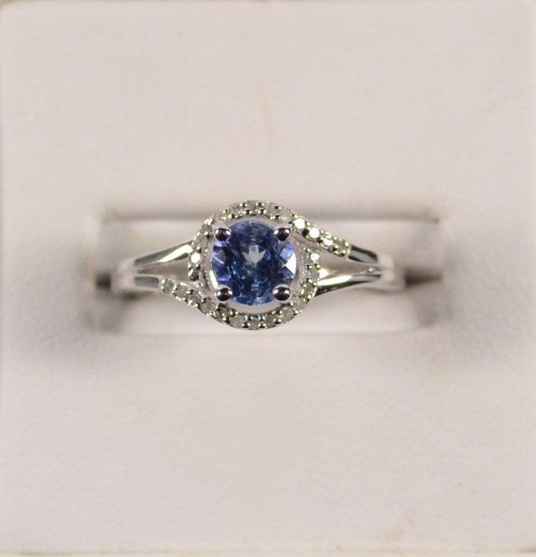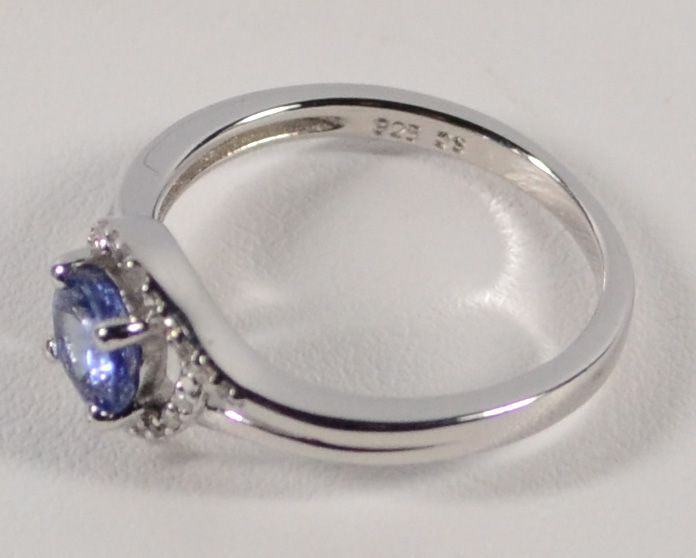 This Stunning Violet Blue Tanzanite is set in .925 Sterling Sliver, surrounded by a halo of lovely white diamonds. Tanzanite is .73 ctw. Diamonds are .12 ctw. Ring is a size 7. Gemological Laboratory of America estimates value at $1520.00. (Includes Pa