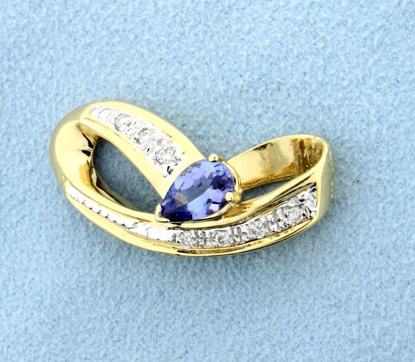 Fantastic 14k yellow gold Omega slide that sparkles with 7 brilliant cut diamonds, 0.15 carats and a pear shaped Tanzanite, 8mm x 5mm, that has an approximate weight of 1 carat! The slide will fit a 6mm Omega or chain or smaller. This piece is like new! 5.1g