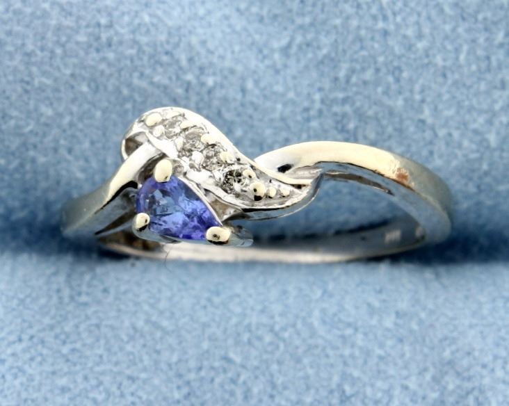 Lovely Tanzanite and diamond ring in 14k white gold. The pear shaped Tanzanite is approximately a 1/4 carat and there are 4, SI clarity and H-I color, diamonds that total approximately 0.05 carats. Size 7 2.3g