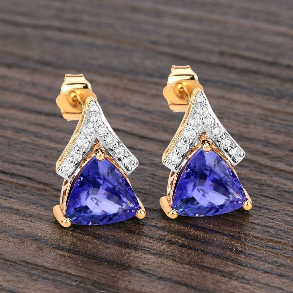 ADDITIONAL INFORMATION: These yellow gold earrings feature amazing trilliant-cut tanzanite that are topped with diamond chevron-shaped caps. This attractive mix of colors and shapes is a style that will remain classic. The gemstones are supported with trussed side galleries and they attach to the earlobe with posts and firm friction backs.