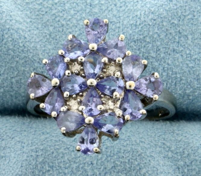 In 10k white gold. Contains sixteen pear shaped 4mm pear shaped tanzanite gemstones with a bright purple blue color and excellent clarity. Size 9 1/4. 3.0g.