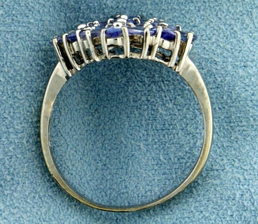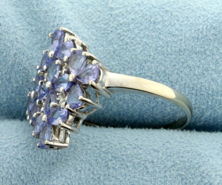 In 10k white gold. Contains sixteen pear shaped 4mm pear shaped tanzanite gemstones with a bright purple blue color and excellent clarity. Size 9 1/4. 3.0g.