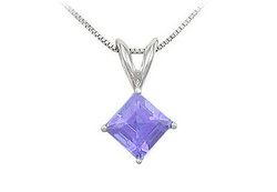 A square natural tanzanite is securely held in a luscious 14K white gold prong setting. This gemstone pendant has a total weight (TGW) of 1.00 and comes with a standard 16 14K white gold chain. Available in yellow gold also.