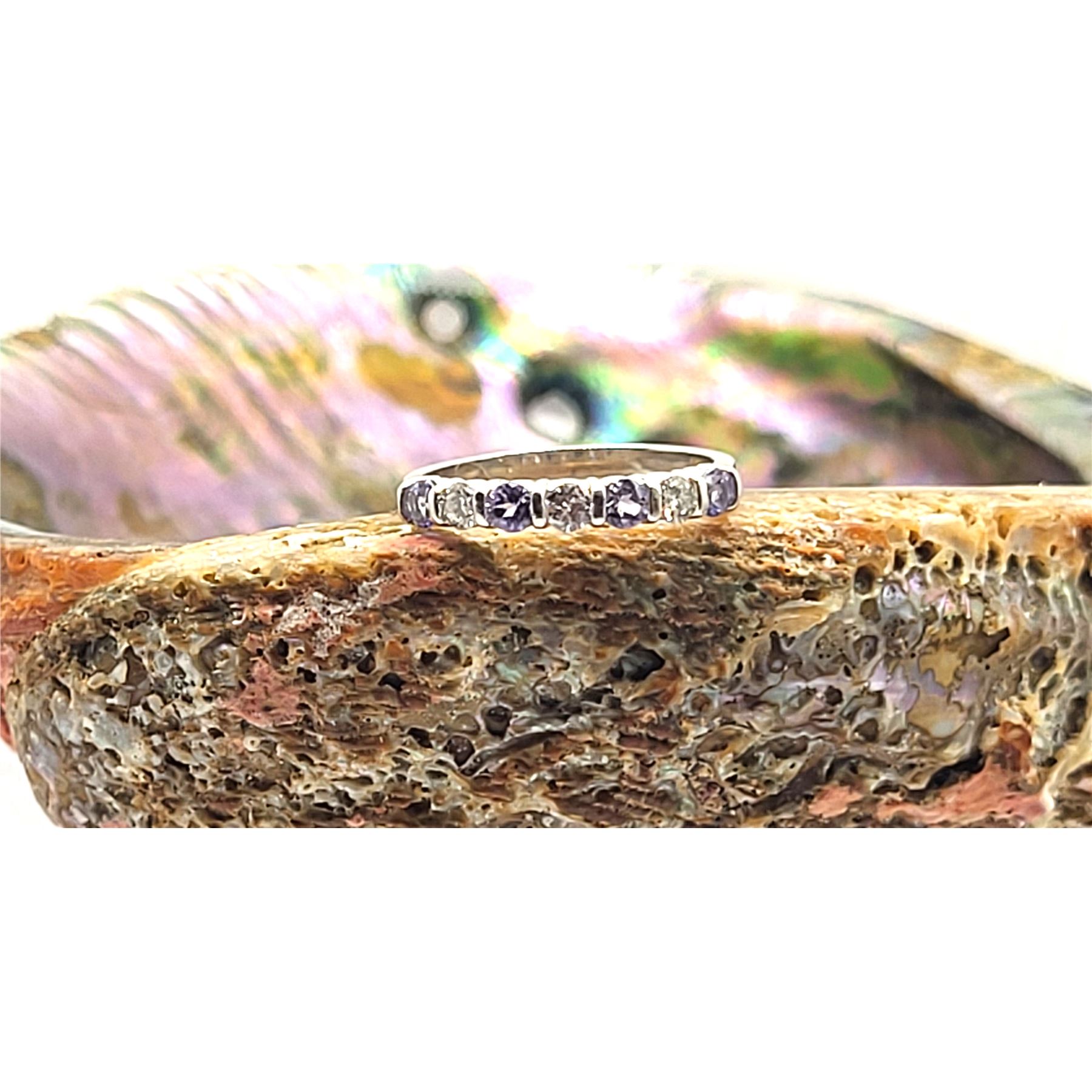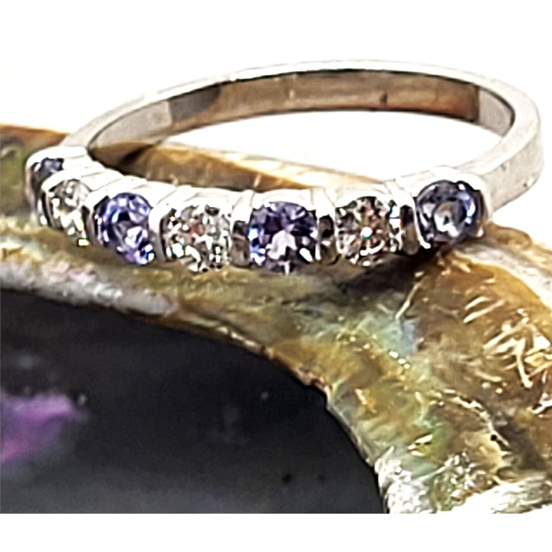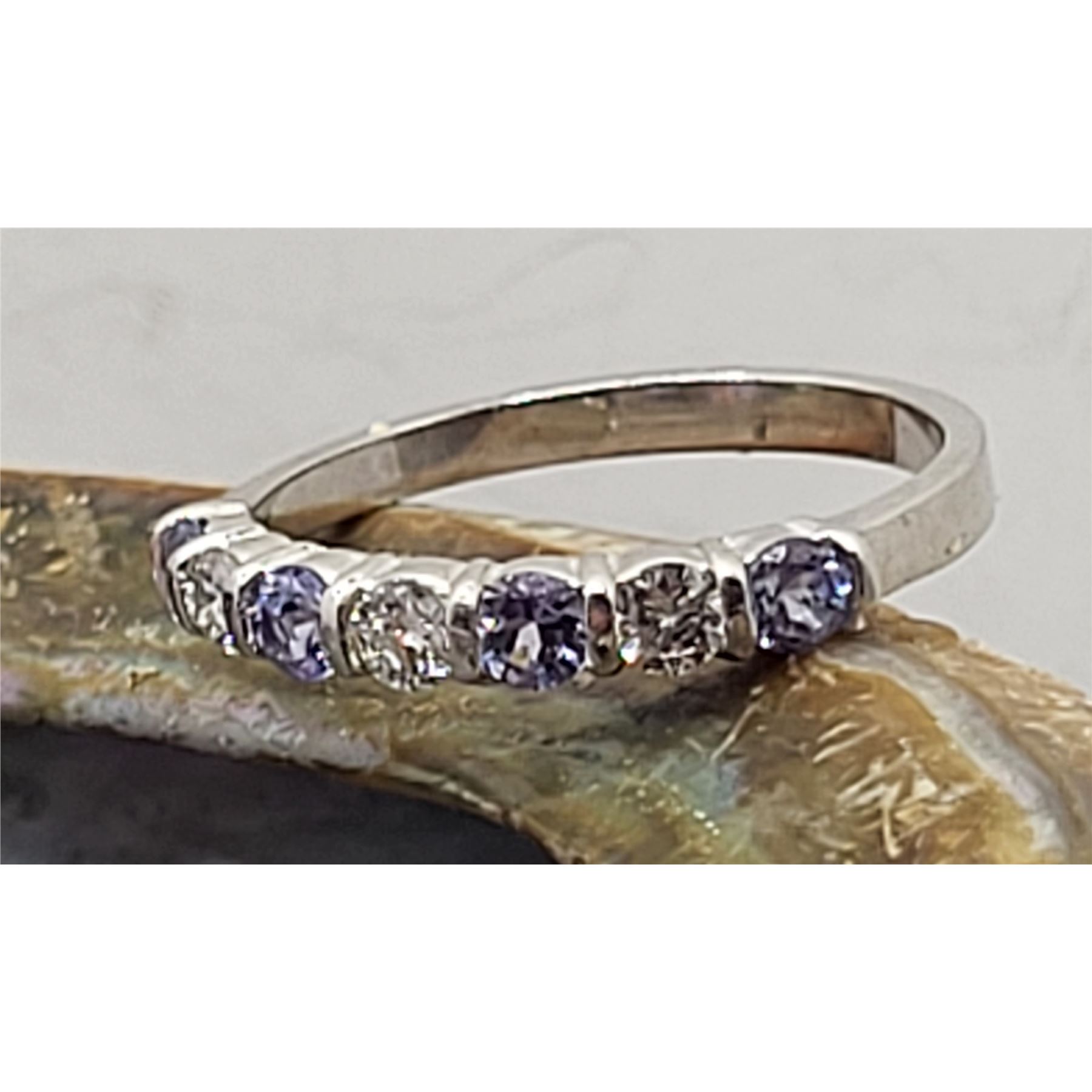 This is a platinum band that features .42 carats total weight of round, faceted, prong-set, genuine tanzanite and .30 carats of round, brilliant-cut, I color, I1-I2 clarity diamonds. The gemstones alternate on the anniversary-style band. It is US size 7.25 and can be sized for an additional charge. This item is eligible for appraisal at a discounted rate, from an independent appraiser (with qualifying credentials from GIA) with no affiliation to Bidfair Fine Jewelry. Please contact Bidfair Fine Jewelry for more information on appraisals and sizing. Admin: G11241/3aat