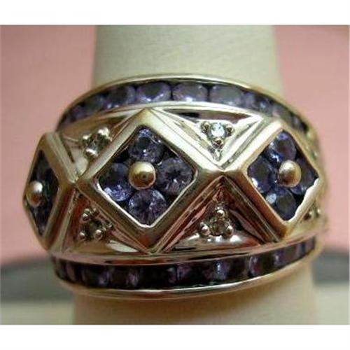 Beautiful Tanzanite and Diamond Cigar Band Ring in 14K WG. There are 34 Round Tanzanite Stones at .05 each and 8 round diamonds at.01 each for total weight of 1.78 carats. The ring is a size 7 1/2 and weighs 6.2 grams of 14K White Gold. It is stamped 14K and trademarked inside the shank. It is 14mm wide at the top and 2.6mm at the shank. When seen on the hand, this ring looks like an estate piece from long ago.