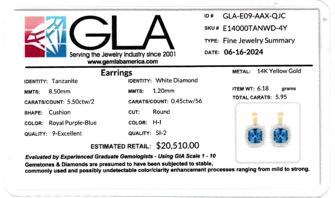 APPRAISAL REPORT: These earrings are certified and appraised for $20,510.00 estimated retail replacement value by GLA.