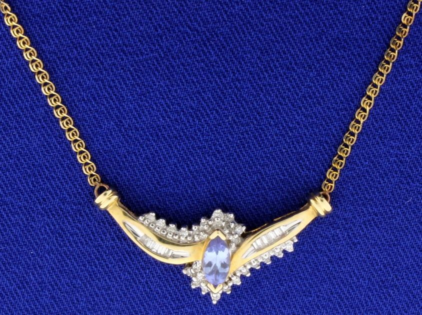 In 14K yellow gold it is 19 inches long and contains 1/2ct tanzanite gemstone with excellent color and clarity. Also contains 1/2ct total weight of baguette and round diamonds. 5.2g