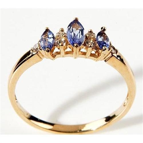 Size 9---This 14kt. yellow gold ring features natural tanzanite and diamonds (3 stones .72ctw. marquise, violet/blue tananites and 6 stones .06ctw. round SI diamonds).