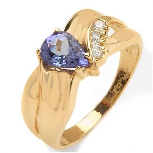 Size 6: One pear cut, .71ct. violet/blue tanzanite and four round cut, .09ctw. bright, SI1 diamonds are prong set in this 14kt. yellow gold ring.