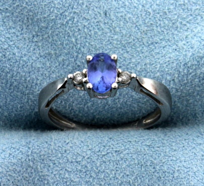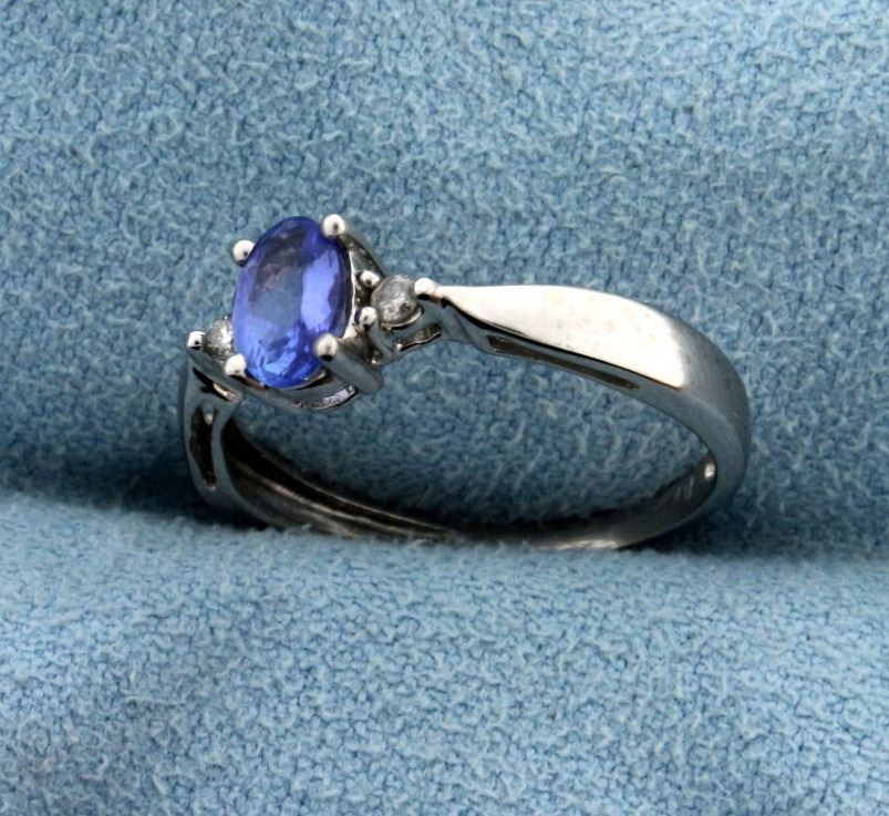 In 14k white gold, containing 1/2ct High Quality Tanzanite Gemstone with excellent color and clarity. Also contains two .02ct diamonds. Size 6 1/2. 2.8g.