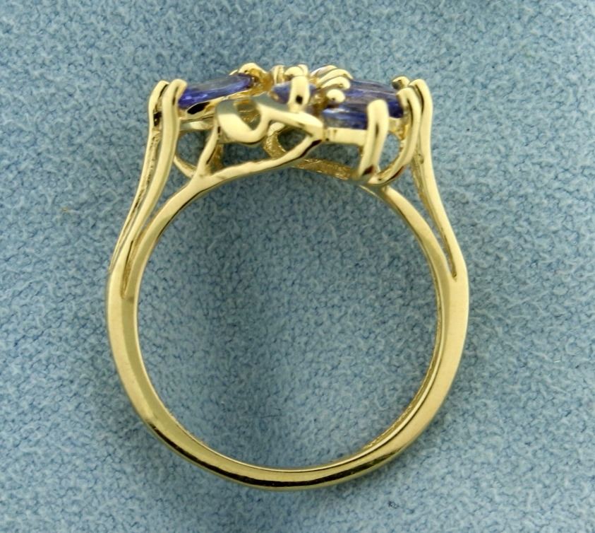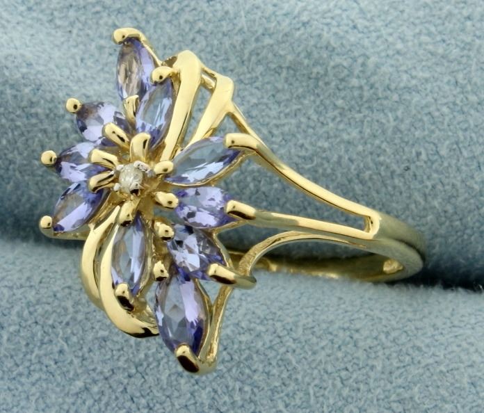 In 14k yellow gold. Contains ten marquise shaped natural tanzanite gemstones, 4 to 5mm each with excellent clarity and soft blue purple color. Also contains one high quality .02ct diamond. 3.2g.