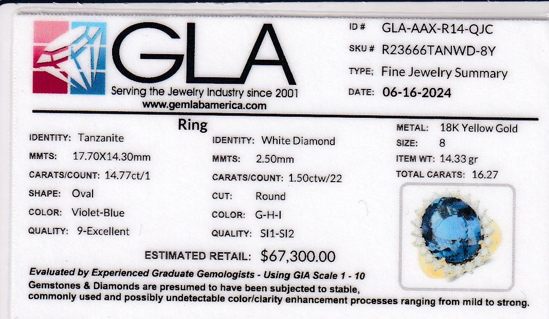 APPRAISAL REPORT: This ring is certified and appraised for $67,300.00 estimated retail replacement value by GLA.