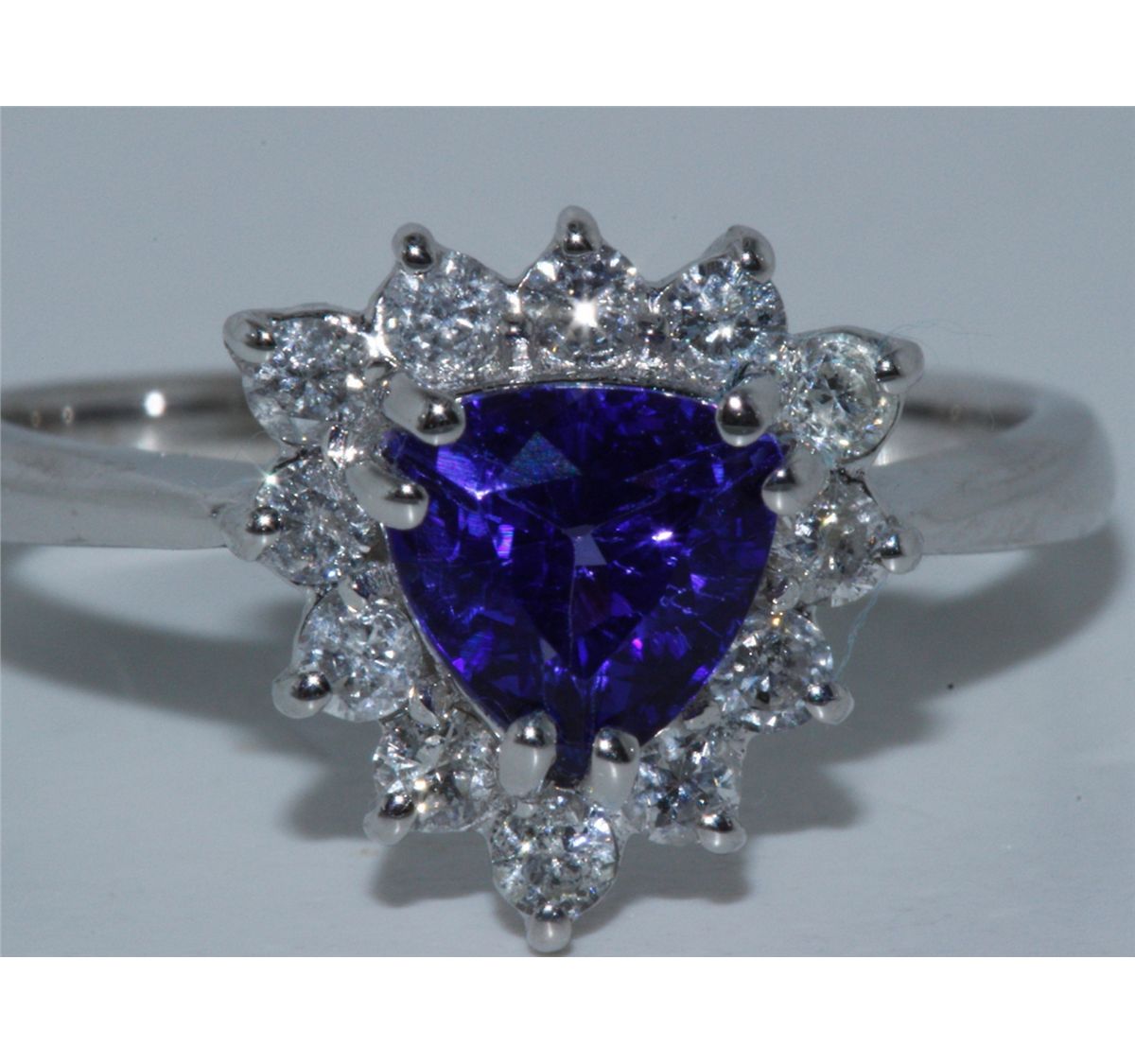 18k White Gold, Tanzanite 1.21ct Excellent Trillion Cut Very Good Color, .41cttw Round Diamond G-H color VS-SI clarity, Stunning Ring