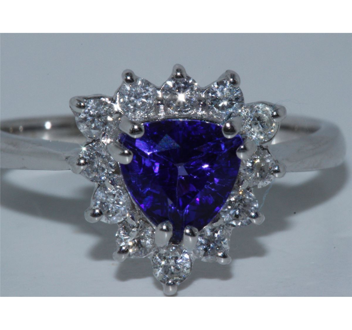 18k White Gold, Tanzanite 1.21ct Excellent Trillion Cut Very Good Color, .41ctw Round Diamond G-H color VS-SI clarity, Stunning Ring