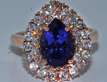 18k Rose Gold, Tanzanite 3.12ct Excellent Pear Shape Very Good Color, 1.07ctw round Diamond G-H color VS-SI clarity, Stunning Ring
