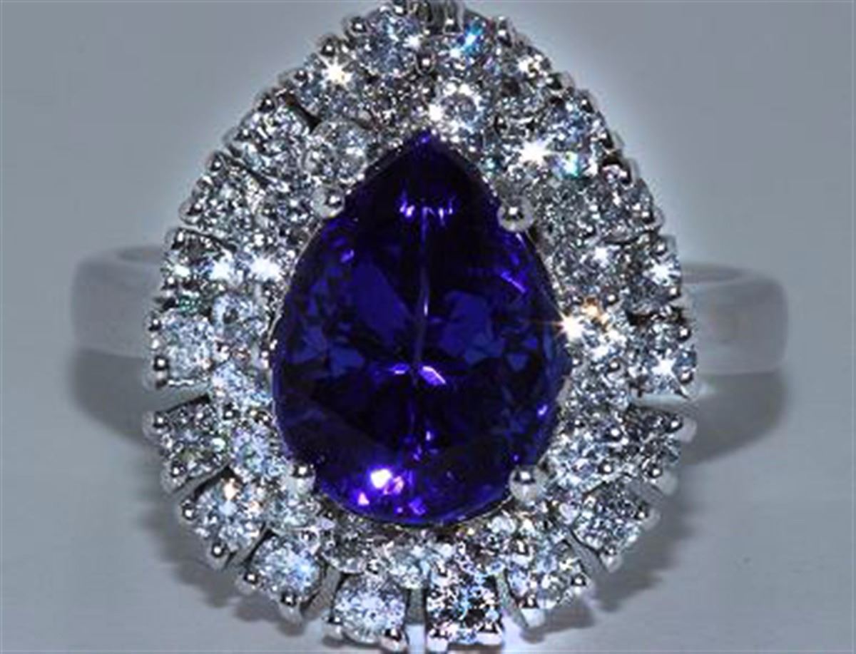18k White Gold, Tanzanite 3.50ct Excellent Pear Shape Very Good Color, .93ctw Round Diamond G-H color VS-SI clarity, Stunning Ring