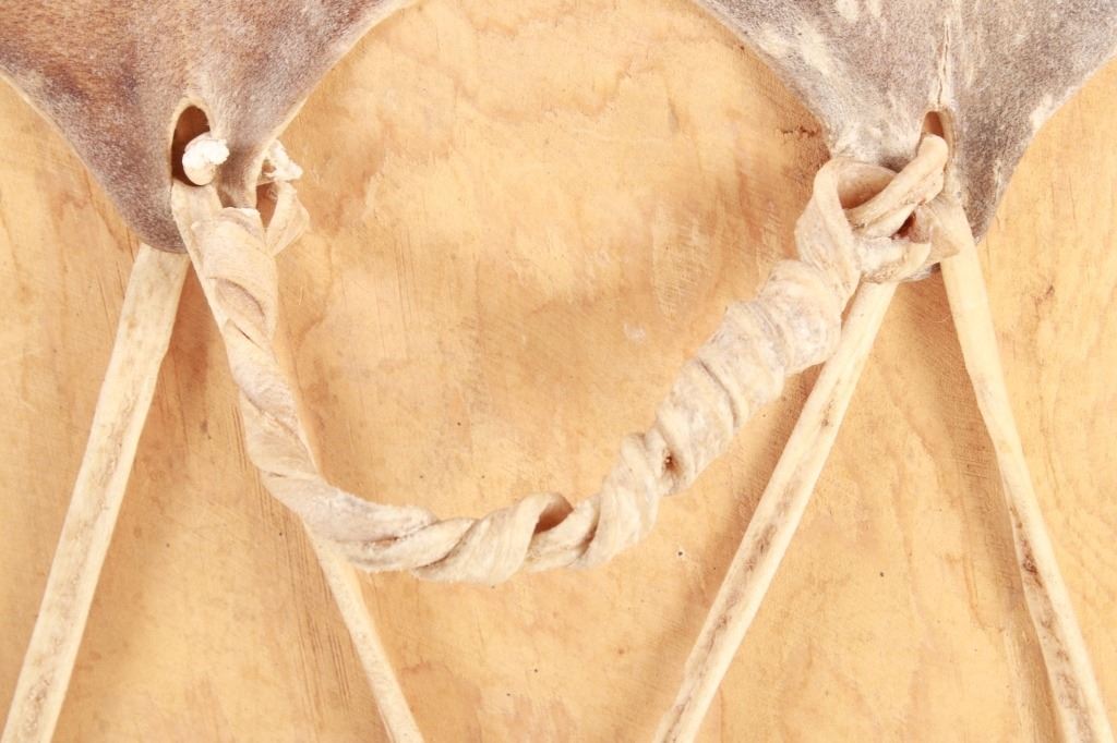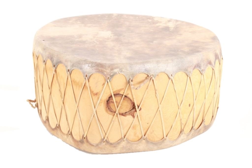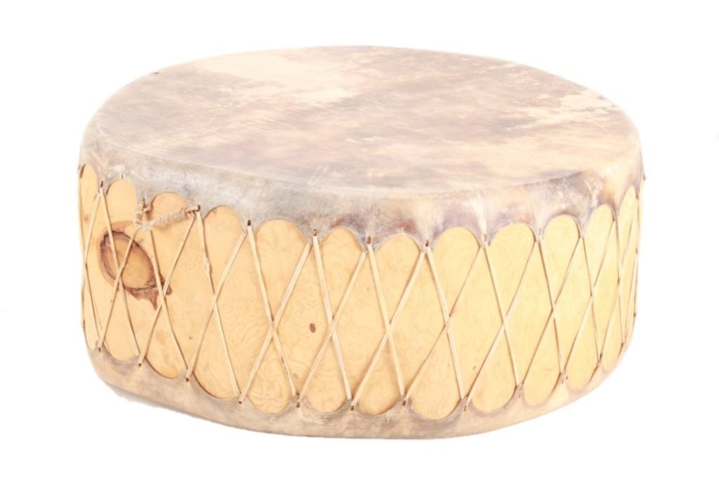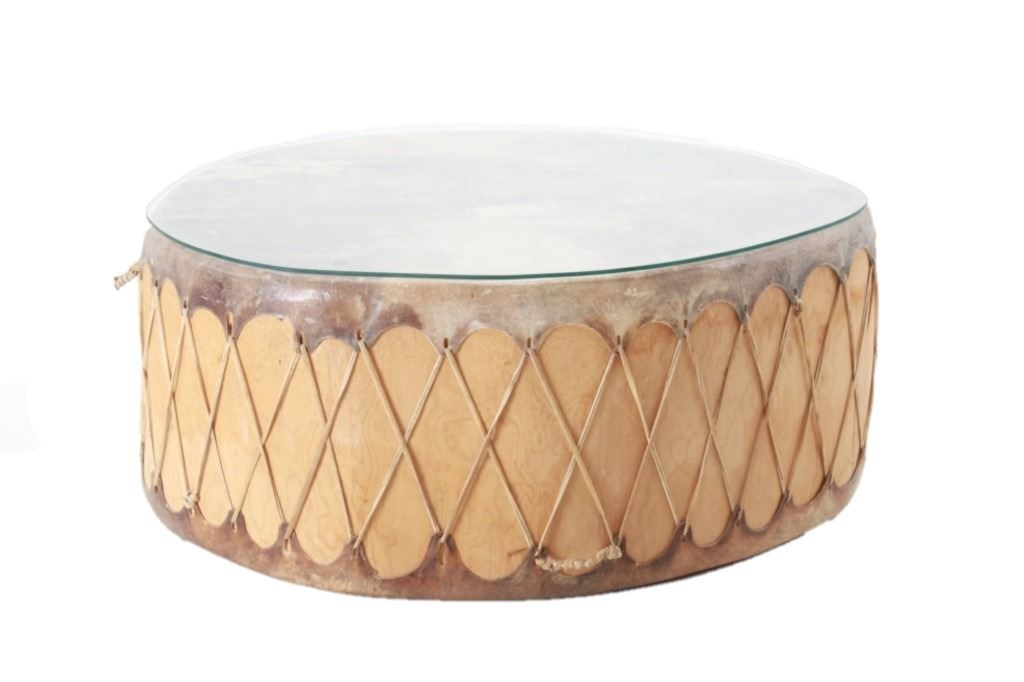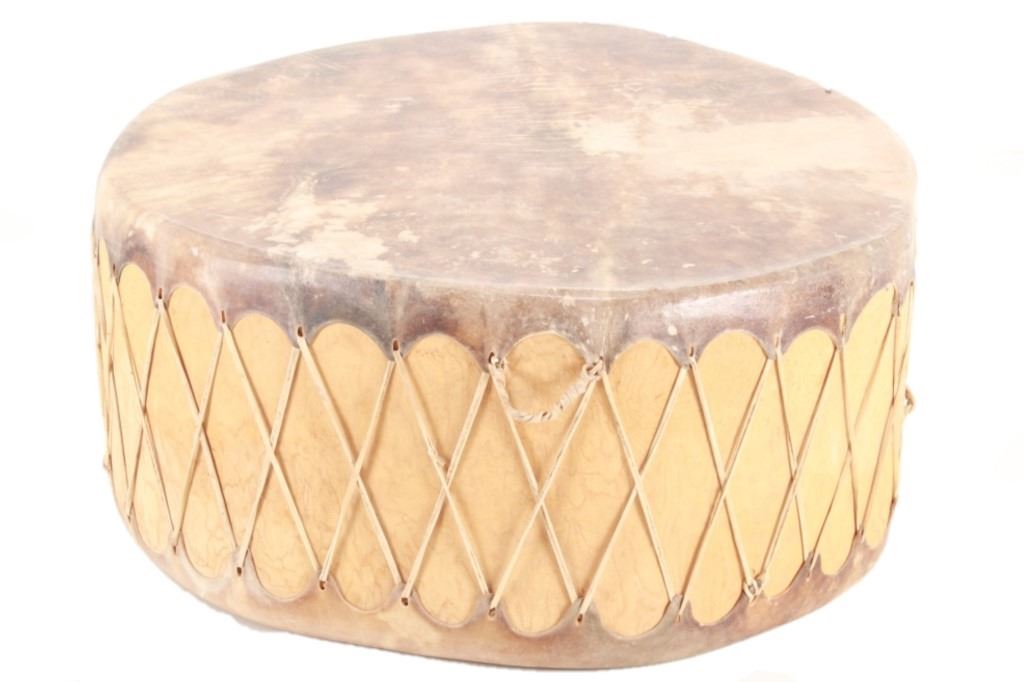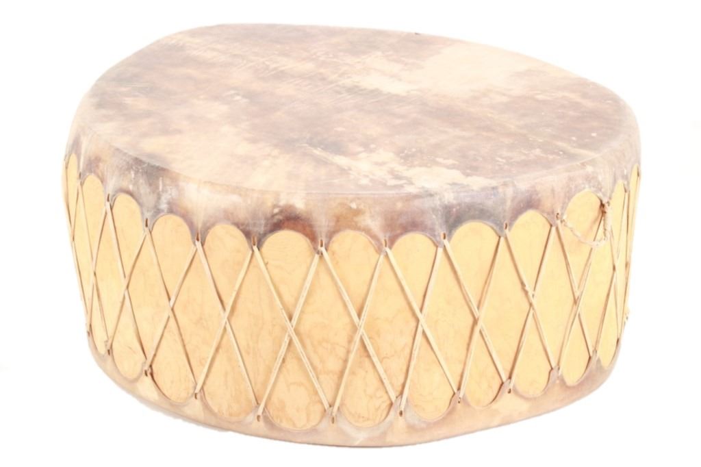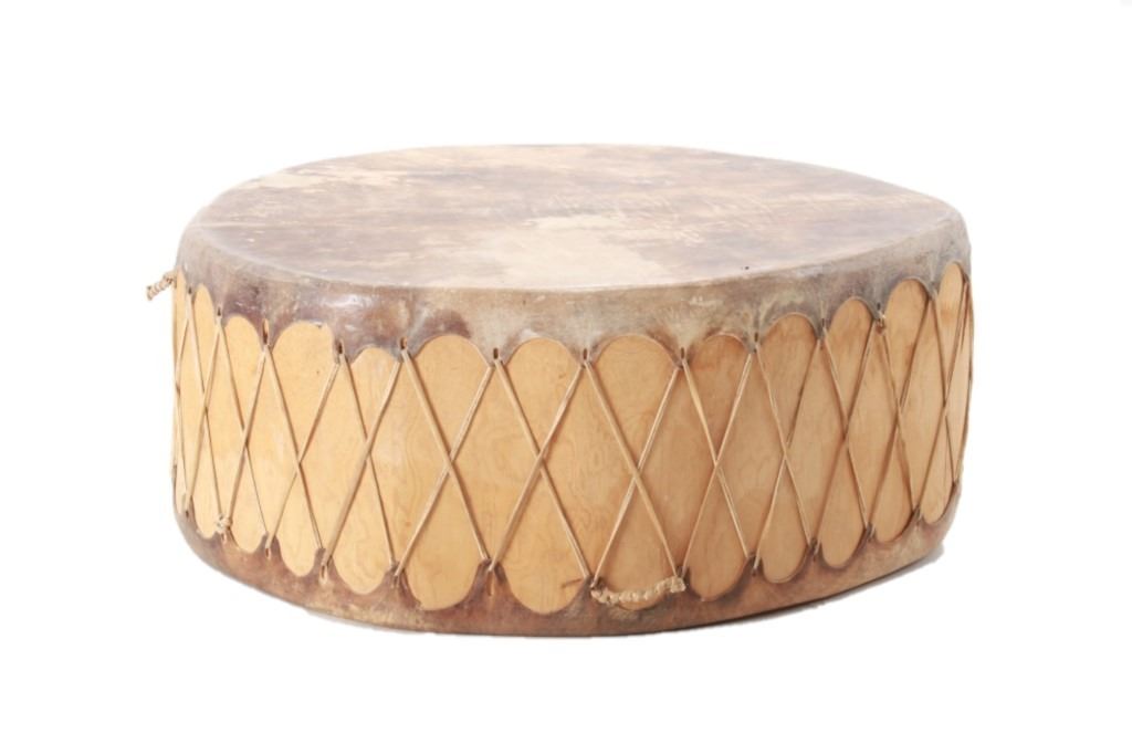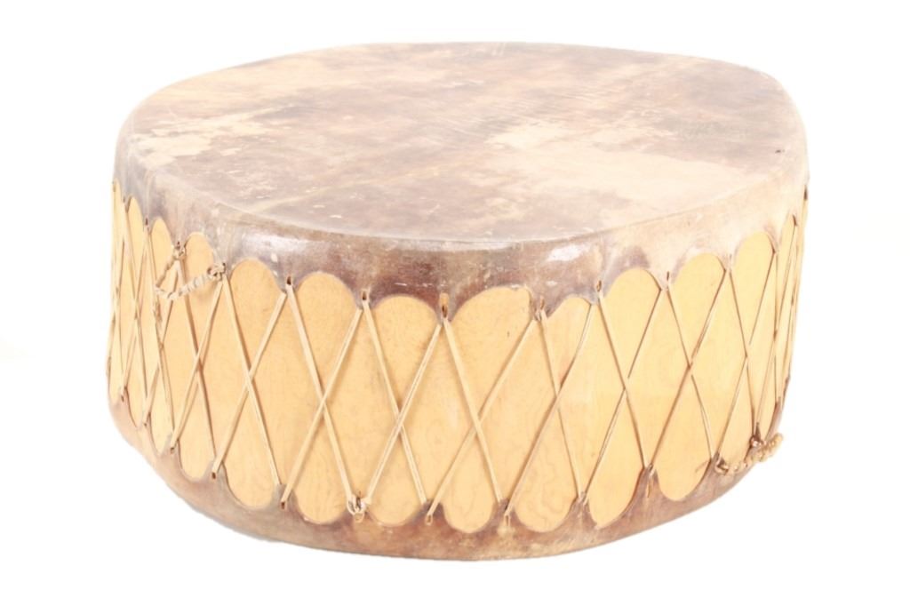 The lot features a large rawhide stretched one log wood carved drum from Taos Drums, the piece can be used as a coffee table as it comes with a custom cut glass top. The top has a single piece of custom cut glass which follows the shape of the drum allowing it to be used as a piece of furniture / coffee table without altering or damaging the amazing workmanship and beauty of the rawhide along with elevating any room to be a Western American Indian showcase. The drum is all handmade from the Taos Drum workshop and is made by native craftsman artist from the Taos Pueblo ages-old tradition of drum making. This drum is one of the larger sizes they make and is considered a one tree or one log drum as the drum is crafted from one large tree trunk which is burned and carved out at the center leaving the ridged wood outer core in one piece then covered in two rawhide parfleche thick wraps, one on the top and bottom, which are wetted and stretched over the wood and tied with rawhide lacing which then all dries giving a taunt hard surface with amazing deep sounds. The hide is hand scalloped, stretched and secured with rawhide lacing to the frame. This drum has its own distinct voice of deep bass that you feel as much as hear. This drum is as much a piece of art as it is a musical instrument in its simple beauty. The drum measures from 38"-38 1/2" across and 16 1/2" thick. Both sides have playable Parfleche hide skins. The drum has parfleche braided handles on the side one of which has broken but other than that is in very good condition.