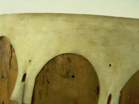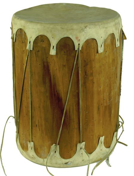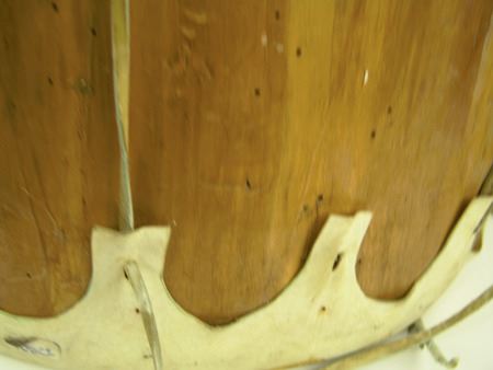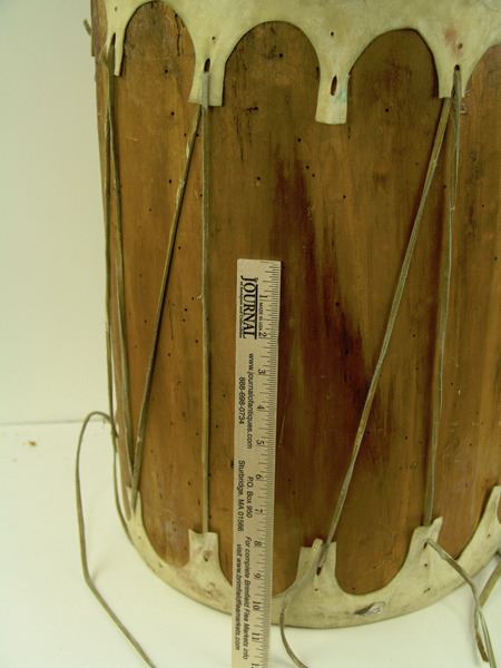 Ca. 1960s, Large, hand crafted cottonwood drum with rawhide faces and lacing. Very good condition, but a few of the laces are broken. 19" x 15"