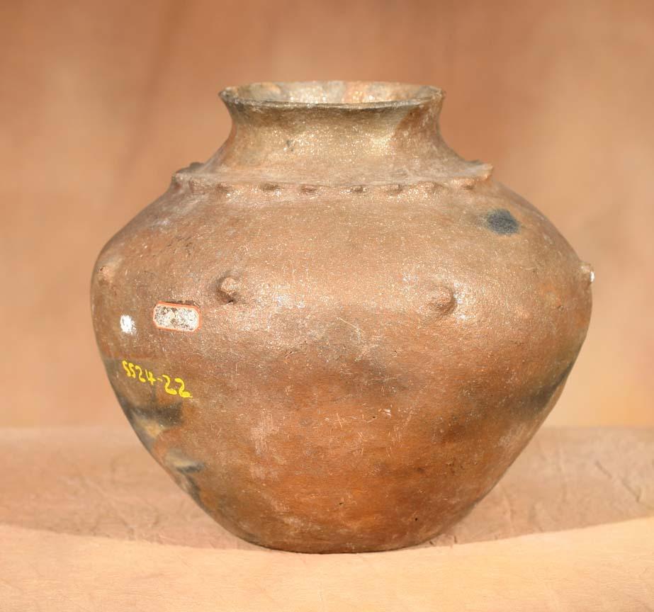 Taos Micaceous Jar . 10" x 10 ½". Jar with knobs, beautiful patination. Circa 1890. (est $1,500-3,000). Provenance: Bethany College, Lindsborg, KS. For condition reports please visit: www.auctioninsantafe.com/cr2011.pdf