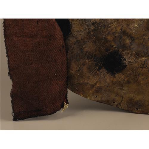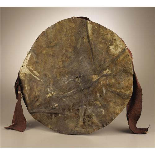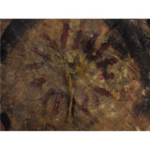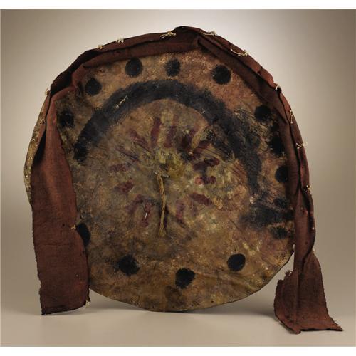 <B>Taos Pueblo Dance Shield</B></I><BR>Circa 1890<BR>Diameter 16 1/2 in.<BR><BR>This late 19th century shield is made of thin buffalo rawhide (as evidenced by the brown epidermis and traces of fur on the reverse). The front is painted with a sunburst in the center, a black crescent above, and a series of black dots around the perimeter. A red trade wool banner is attached to the rim in typical fashion.<BR><BR> <BR><BR><B>Important not