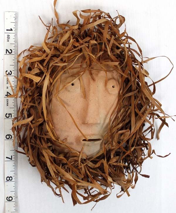 Native American Taos Pueblo Micaceous Clay Pottery Mask, bordered with natural purple cornhusk raffia, artist's intials jk on the back, measures 6'' x 9''