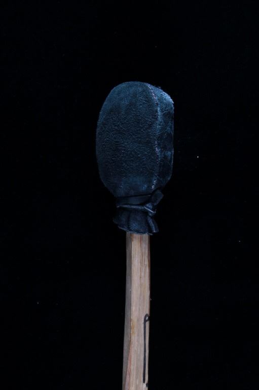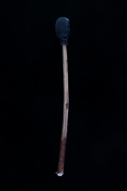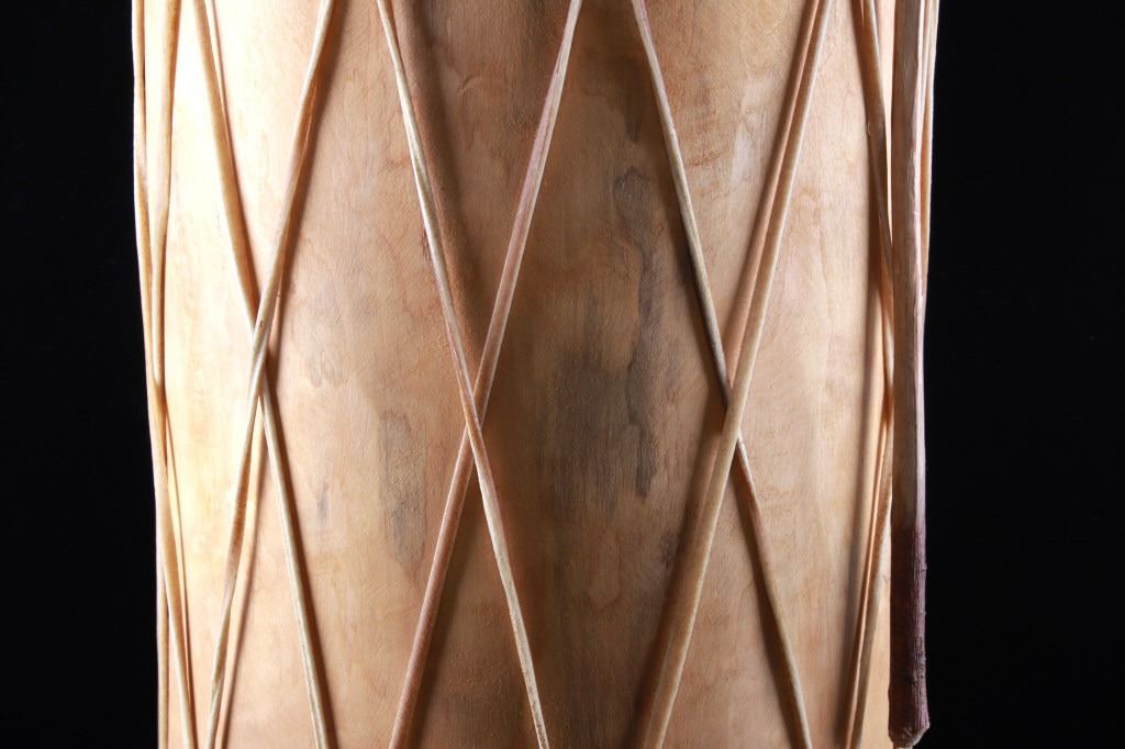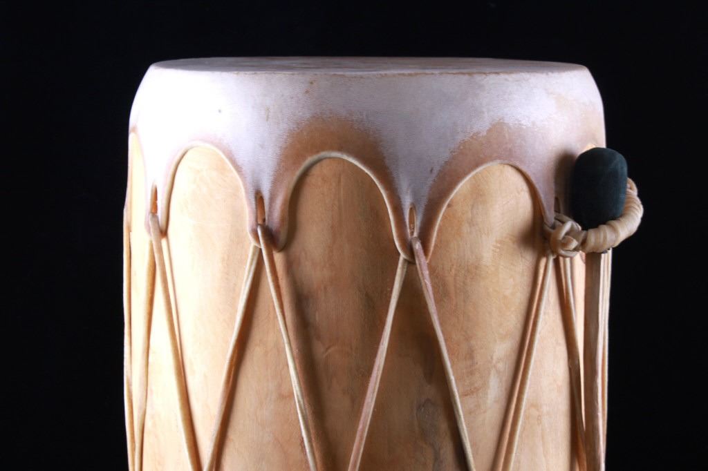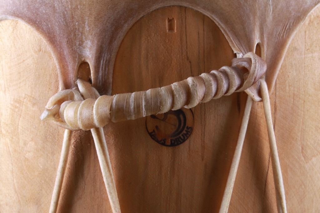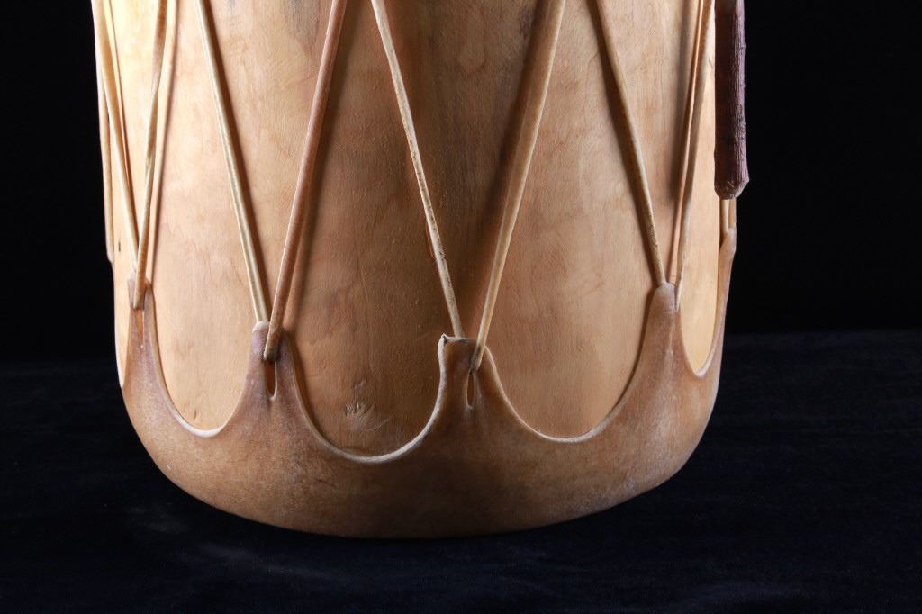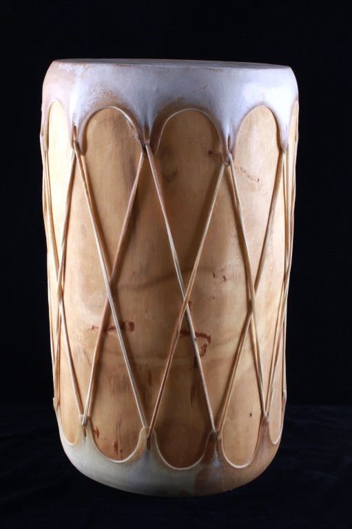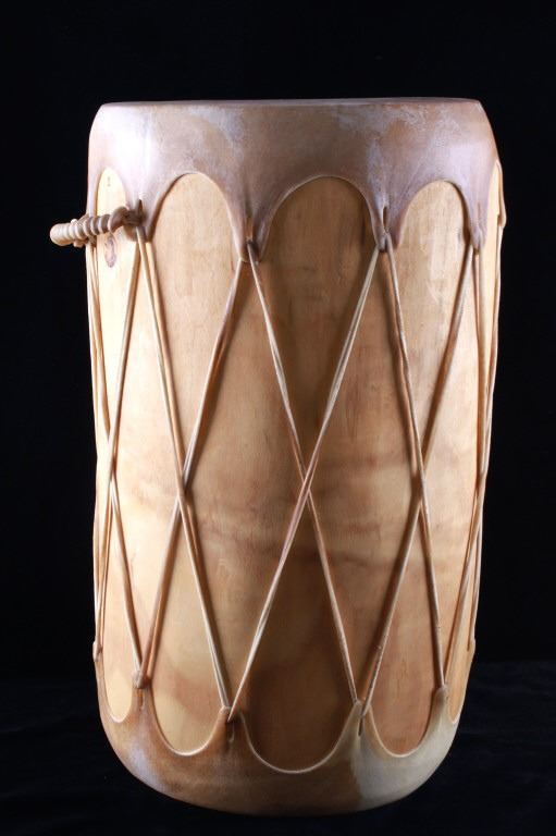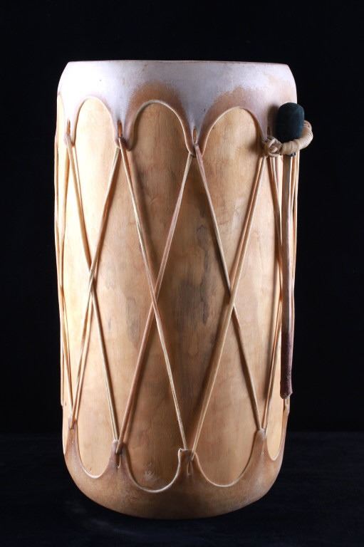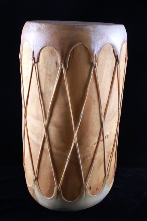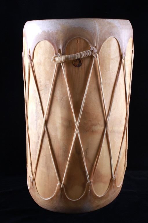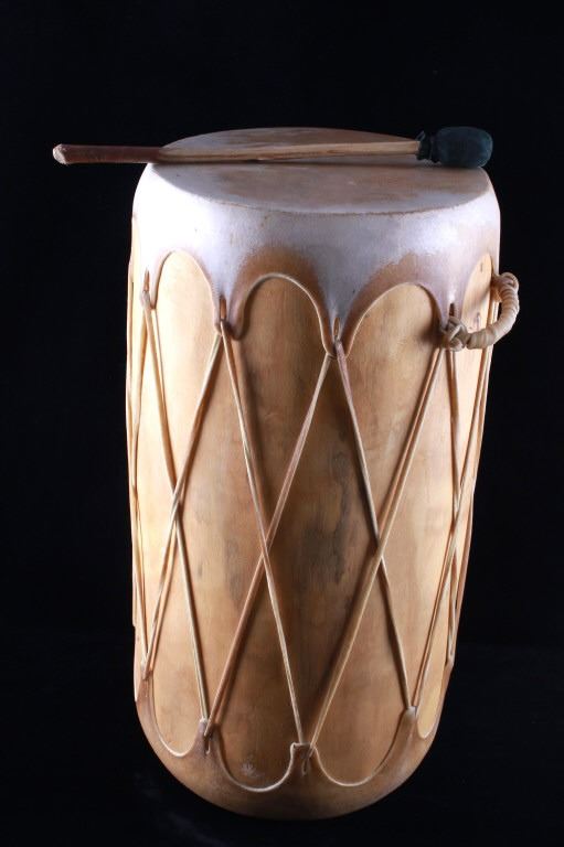 Featured in this lot is this Taos single log rawhide wrapped drum and beater. The drum features a wonderfully and professionally crafted single log construction to the frame and shows rawhide wrapped top and bottom to the drum and shows a hide wrapped beater. The drum is marked 'Taos Drums' by the rawhide wrapped handle to the drum. The condition of this drum is good with no obvious signs of damage and shows good overall condition. The measurements of this drum are 21 1/2" x 12 3/4" x 12 1/2" and the beater measures 14" x 1 1/4" x 1 1/4".