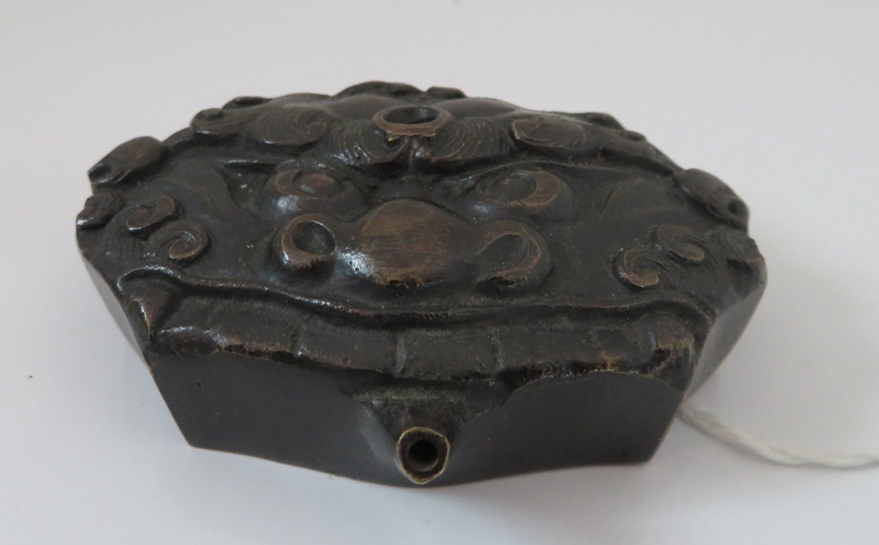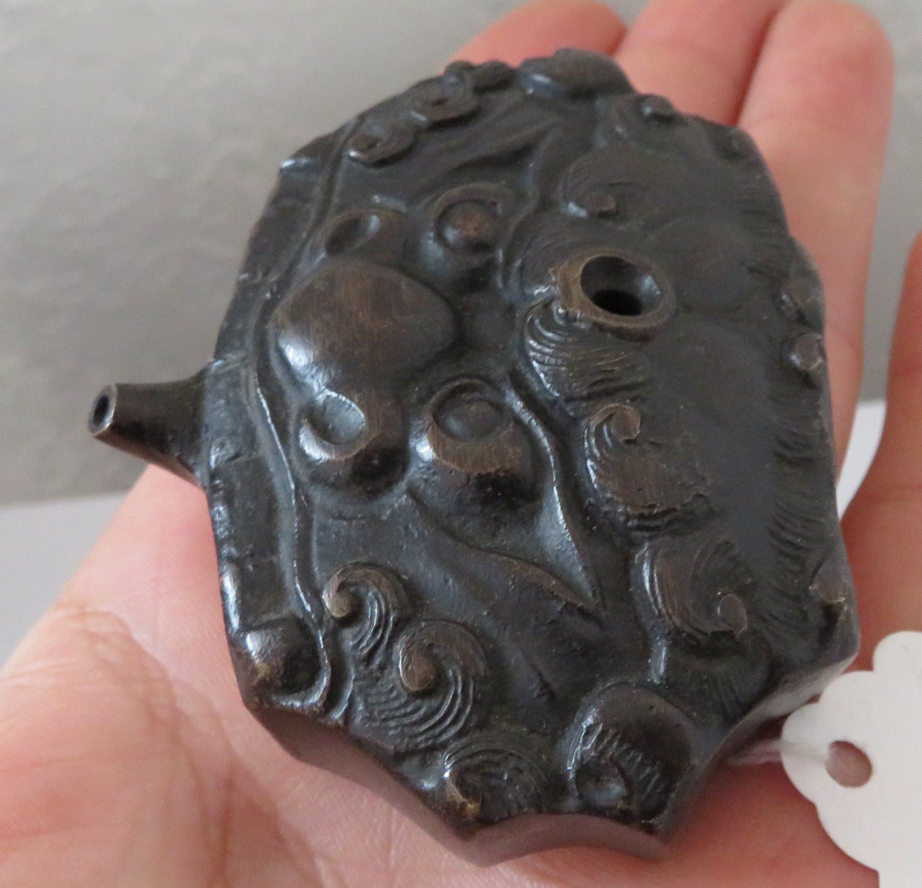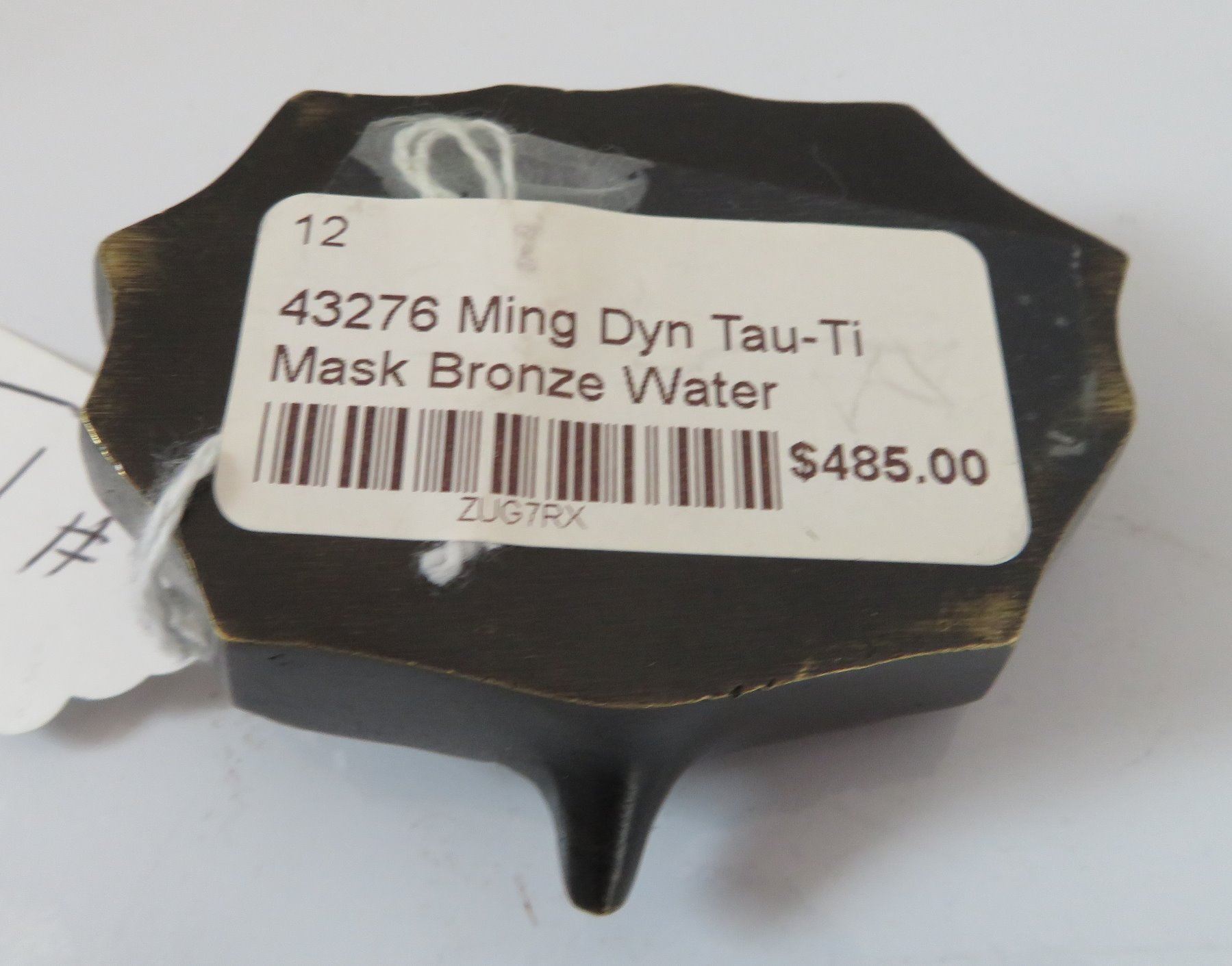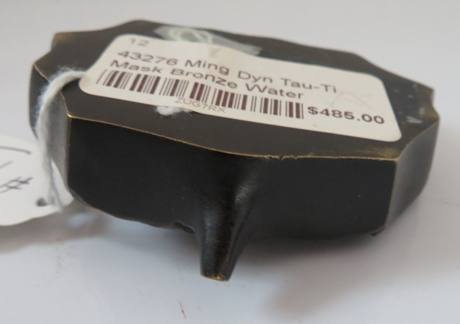Taotie Bronze Mask Water Dripper, Ming period. Made of bronze, the item measures 3" x 2 1/4" x 1/2". China. Condition: Good, nice patina, see images. Shipping: $18.50 w/insurance and signature, due to value.