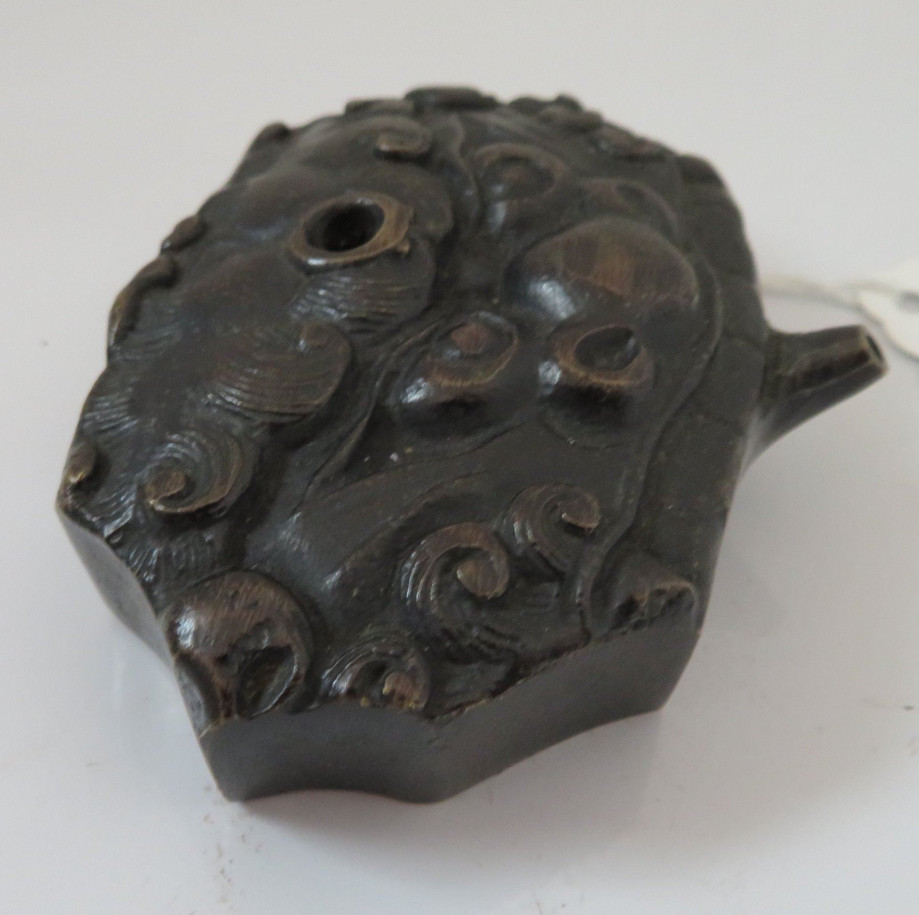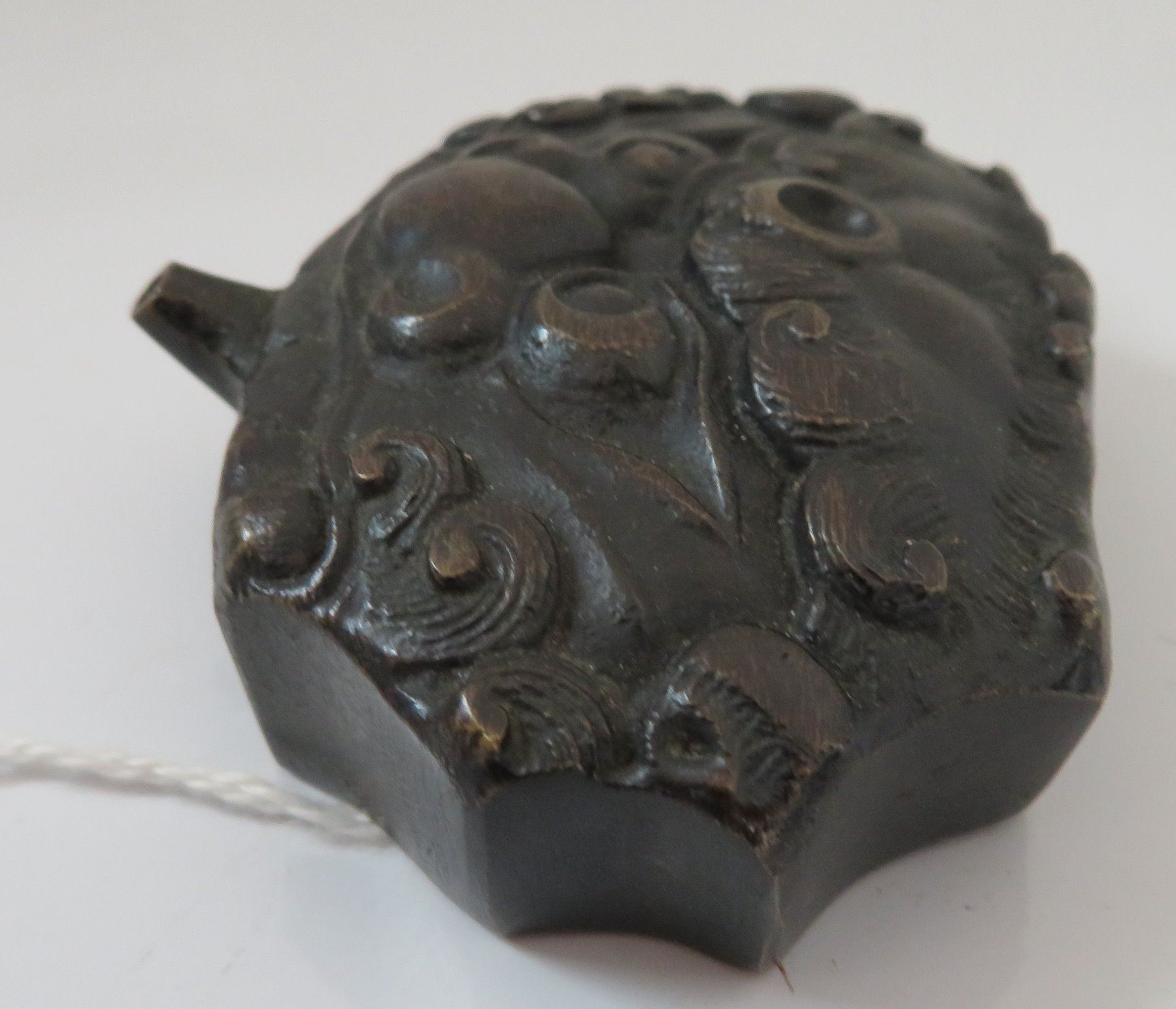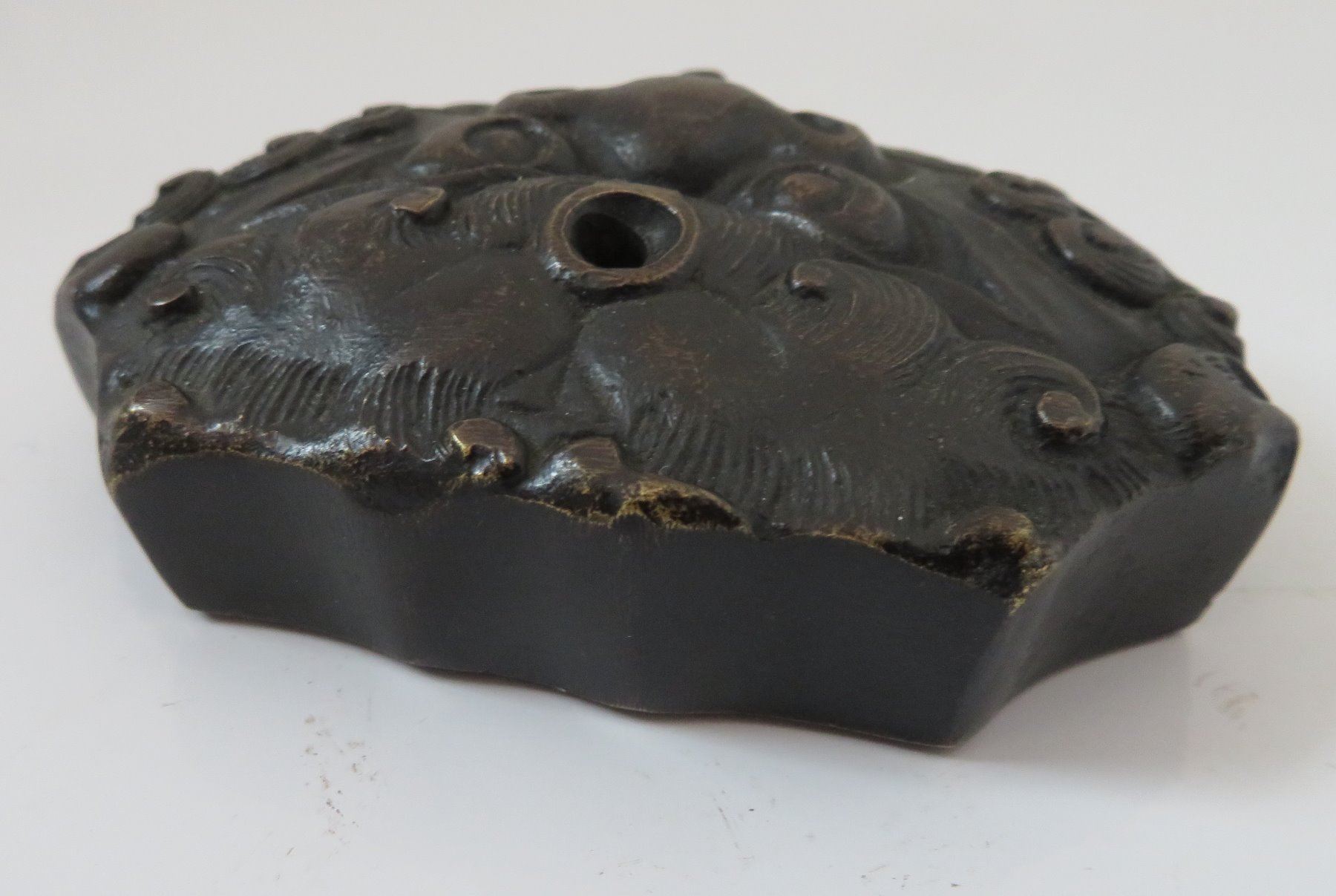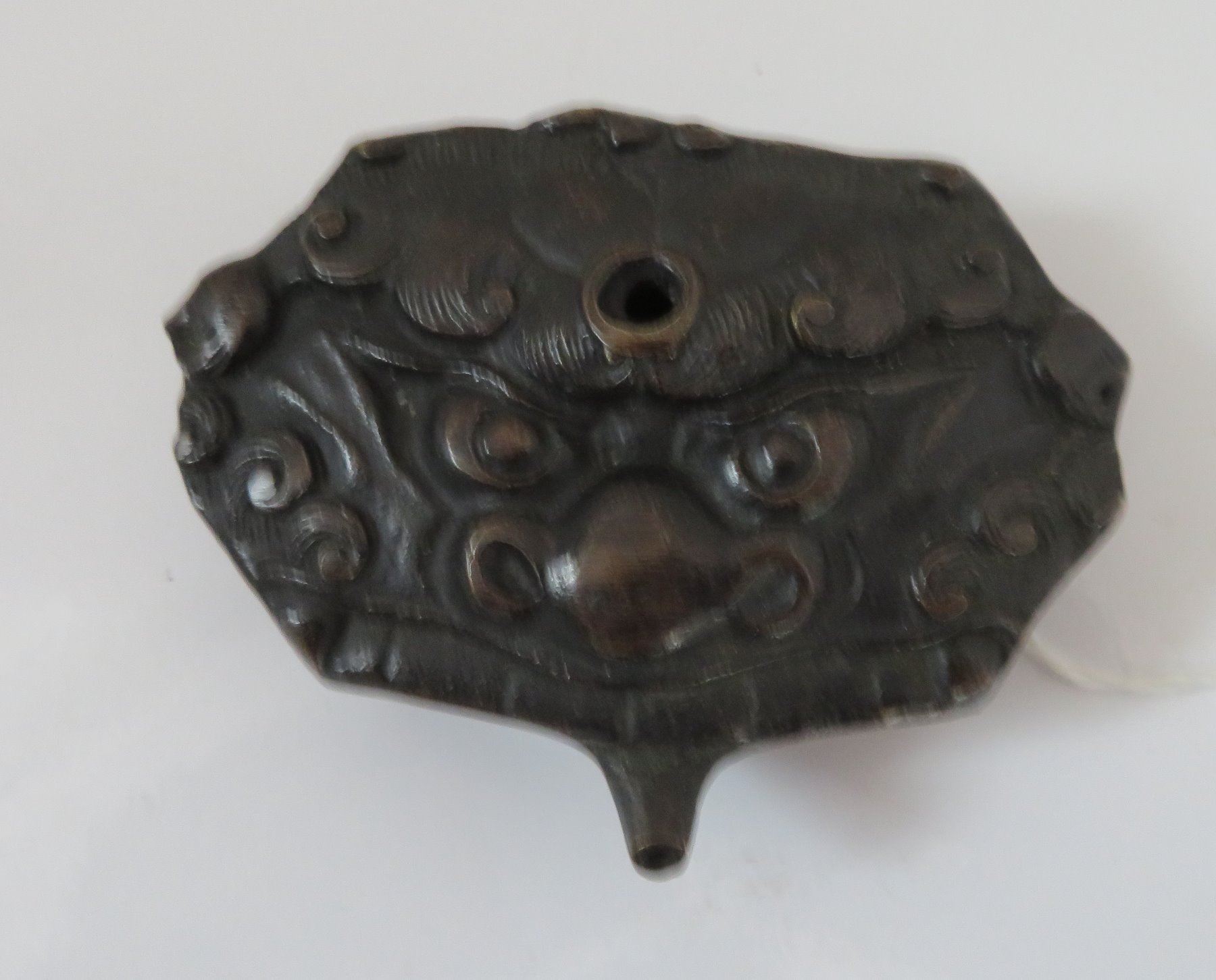 Taotie Bronze Mask Water Dripper, Ming period. Made of bronze, the item measures 3" x 2 1/4" x 1/2". China. Condition: Good, nice patina, see images. Shipping: $18.50 w/insurance and signature, due to value.