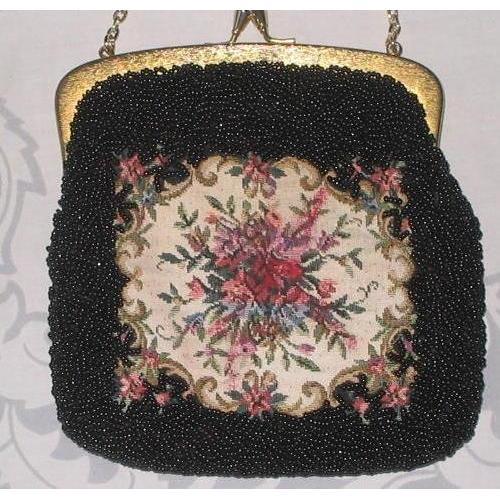 Beautiful evening purse and quite unusual as this has a carry handle long enough that it can be worn as a shoulder bag.  Hand made in Hong Kong by Duval, a well known designer of very beautiful evening purses.  The front and back have the same design, a centre piece of floral tapestry surrounded by a multitude of little black glass seed beads.  The colours in the tapestry are mostly pinks and rose colours with leaves and vines in sage green, forest green, autumn harvest and gold.  No missing or loose bead work. The fittings are gold tone and there are a couple of small areas along the top of the frame showing a little wear consistent with age.  A small mark on one side of the tapestry looks like it could be a lipstick mark and would probably clean out.  On the other side there has been a small amount of colour bleed at the bottom of the tapestry but is only really noticeable if looking for it.  The frame is brushed gold tone and the lining is black satin with one interior slip pocket.  The interior is perfectly clean and no damage.  The measurements are 6-1/4" inches wide by 7" inches in height and the shoulder chain strap handle has a height or drop of 14-1/4" inches from the top of the frame.  Very lovely !