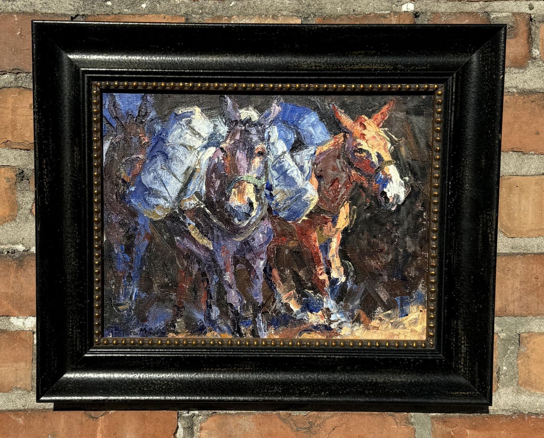 Title is Pack Train. 9" by 12" unframed. 13" by 15 7/8" framed. Tara Moore (Born 1950) is active/lives in Maryland. Tara Moore is known for Wildlife and waterfowl painting. Tara Moore's passion for exploring the wilderness and capturing the spirit and emotion of animals in their natural habitat has led her to travel the globe in search of inspiration. A resident of Montana, she now finds inspiration in the animals around her home, constantly striving to capture their movement and spirit in her paintings. As a member of The Society of Animal Artists, Inc., Tara participates in juried exhibitions across the country and has had solo shows in prestigious galleries. She is a regular participant in the C.M. Russell Show and Auction in Great Falls, MT, and was honored in 2007 with the Ralph Tuffy Berg Memorial Award. Tara's work has been featured in various exhibitions, including the Hockaday Museum of Art, the C.M. Russell Museum, and the Montana Land Reliance. Her paintings have also been featured in books and magazines, National Wildlife Federation's Christmas cards, and books she has written and illustrated. She has even written and directed two films, with more to come. Tara's work can also be seen in gallery group shows, charity events, and as a participant in Quick-Draw events throughout the West. The Rocky Mountain Elk Foundation has chosen Tara as the featured artist for the year 2000, and in 2001 she won the GOLD award at the Invitational Whitefish Theatre Jubilee Art Exhibition.