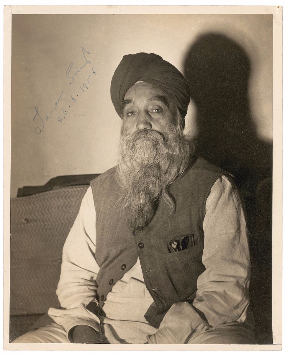 Indian activist (1885–1967) who was a prominent Sikh political and religious leader in the first half of the 20th century. Matte-finish 8 x 10 photo of Singh in a relaxed pose, signed in fountain pen, “Tara Singh, 26.6.1956.” In fine condition, with creasing to corners and a light bend to lower right.