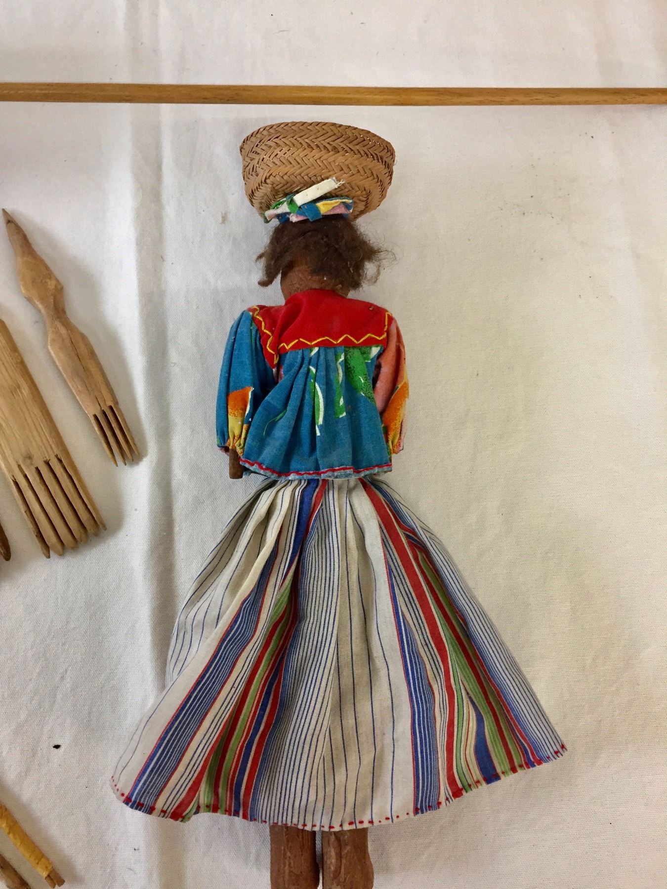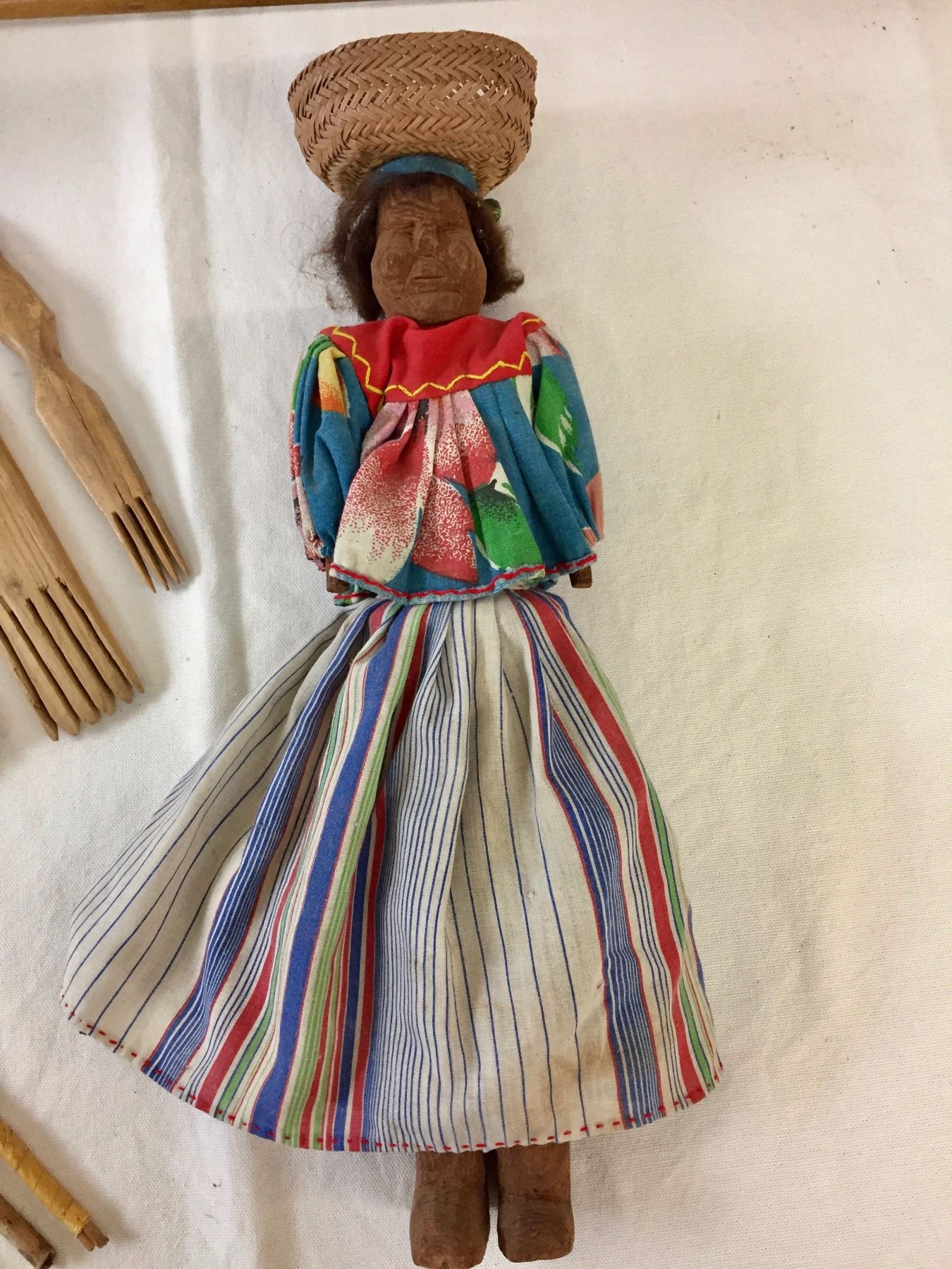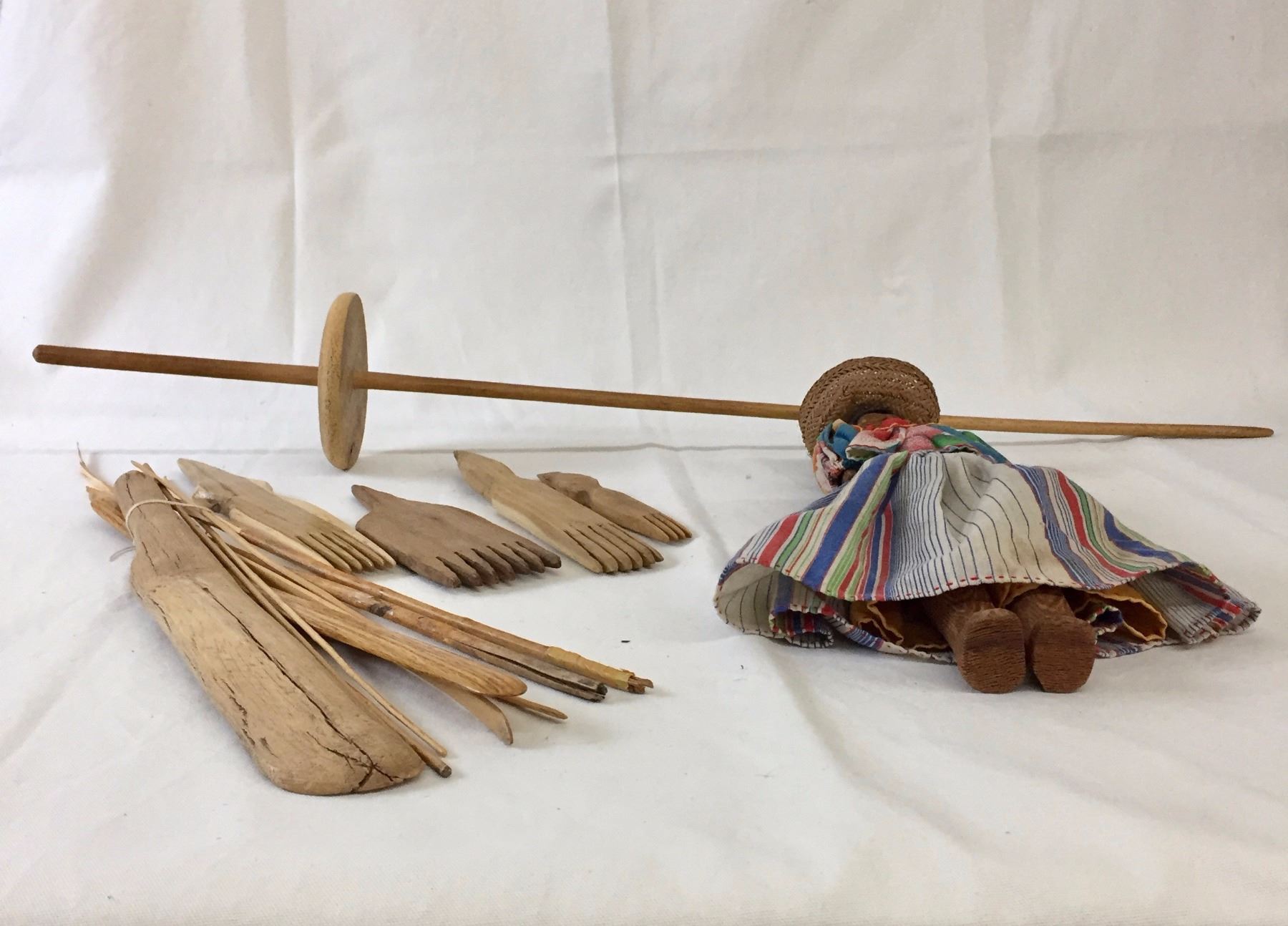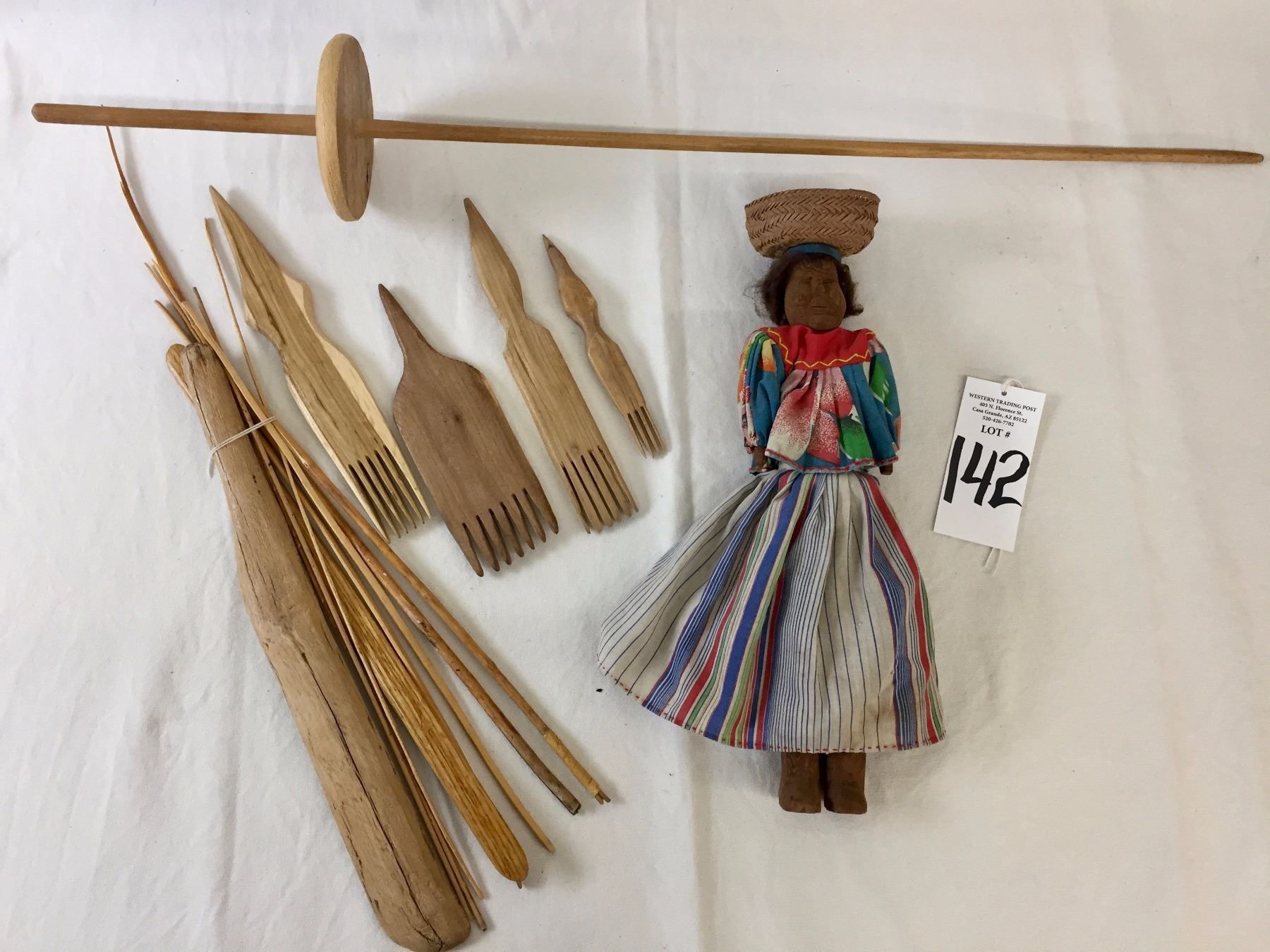 Description: An older Tarahumara doll and vintage Navajo weaving tools. Maker: Various. Approx. Age: Vintage. Size: Doll measures 14 1/2” l x 4” w. Condition: Good for their ages, normal wear expected. Please look closely at the pictures - they are an important part of our description. Shipping: There will be a $8 handling / packaging fee for shipping this lot. The actual cost of postage will be added on top of that.