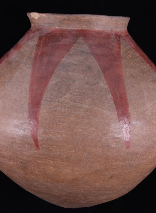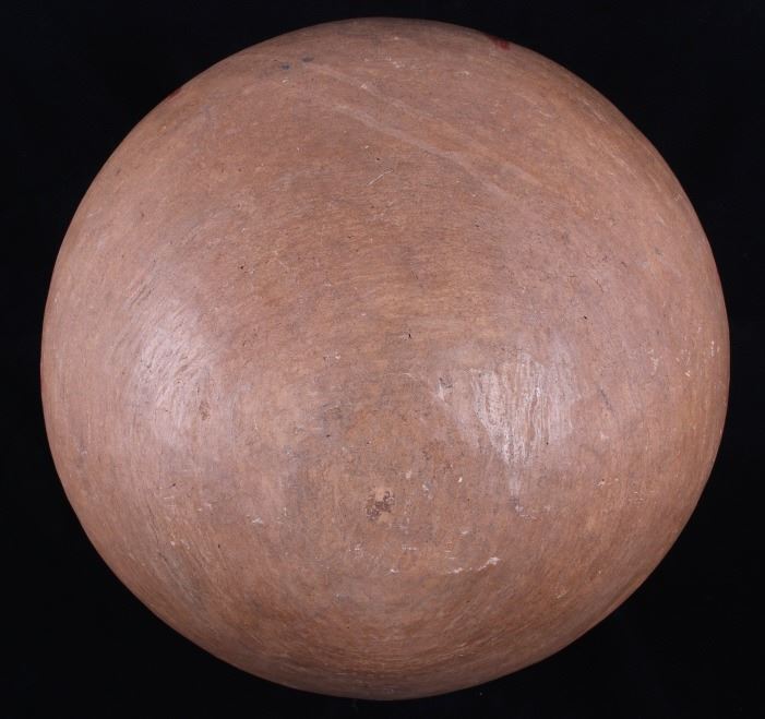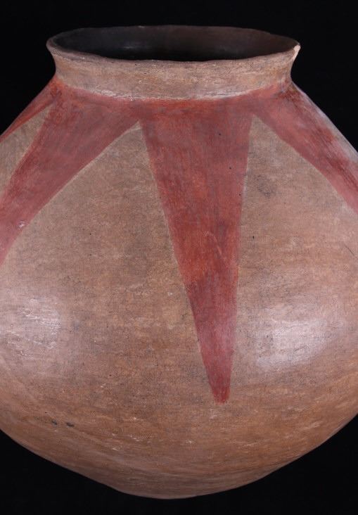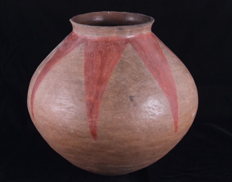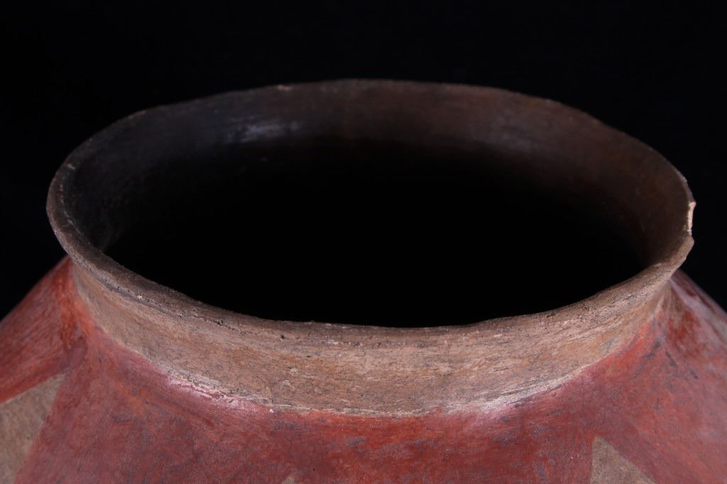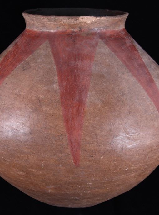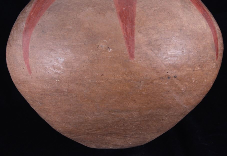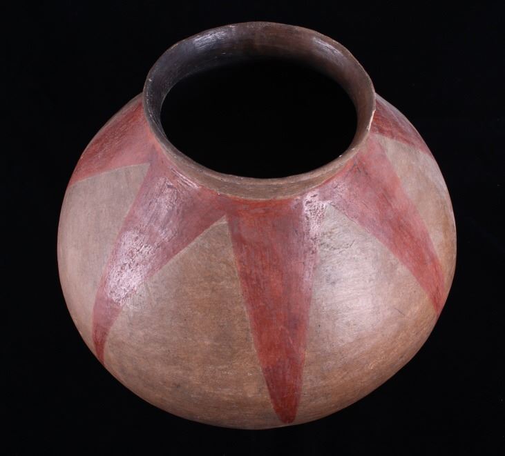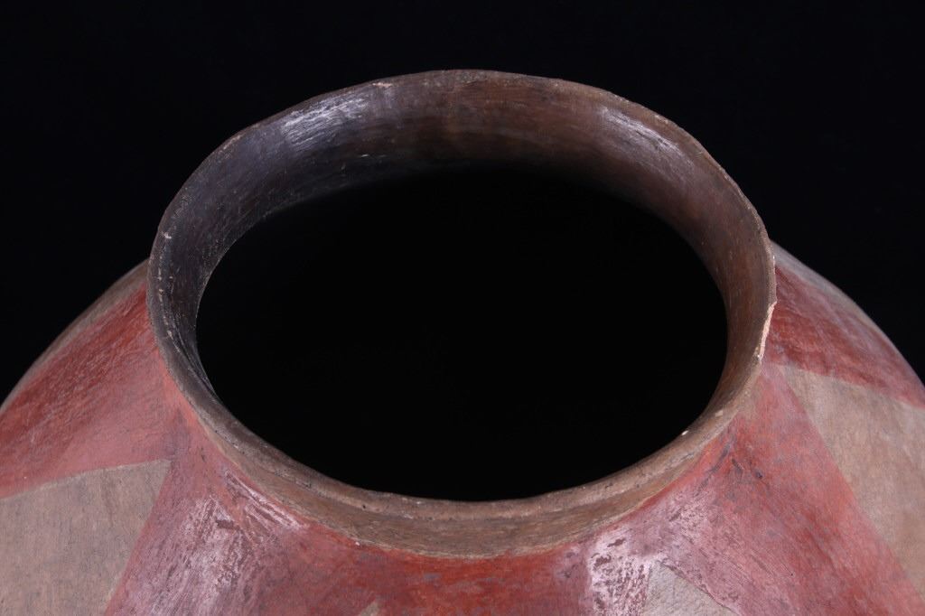 Featured in this lot is this Tarahumara Rarámuri Mexican pottery vessel. The pottery vessel shows a wonderfully and professionally crafted ceramic construction that shows a polychrome decorated side walling that shows triangular decoration in a red paint and shows a flared lip to the pot with a rounded base and graduated side walling. The Rarámuri are believed to be descended from a people of the Mogollon culture. The Rarámuri repulsed and were never conquered by the Spanish Conquistadors or fully converted by the Jesuit missionaries. When the Spanish arrived in the 1500s, they called this native people the "Tarahumara". The condition of this pottery vessel is good with some wear due to age and use of the pot and a small chip to the lip of the pot but otherwise is in good overall condition. The measurements of this pottery vessel are 13" x 13 1/2" x 13 1/2".